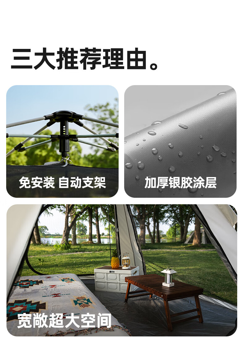 买了帐篷特意来了个亲子游,帐篷真是起了大作用,里面的空间很大,有门顶部还可以通风,里面一点也不闷,没什么异味,质量很好,纱窗网也很密实,蚊虫进不来,发货快,包装给力,超级满意