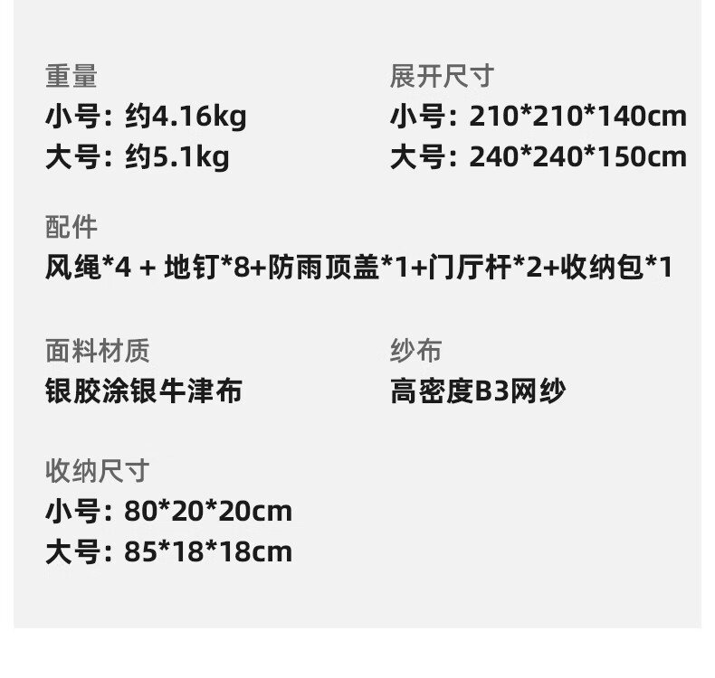 帐篷⛺很不错哟,有纱窗不怕蚊子咬,细节满满质量杠杠的,很大很宽敞 喜欢😍这种大空间的,刚开始不知道怎么安装,谢谢客服的耐心解释