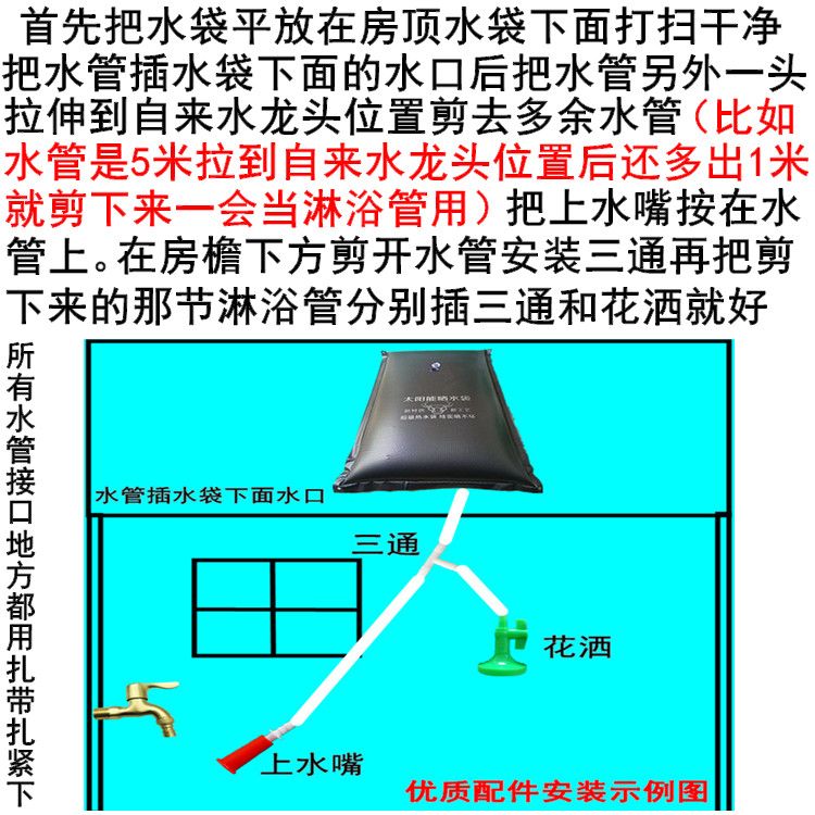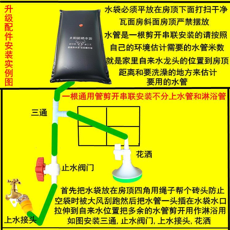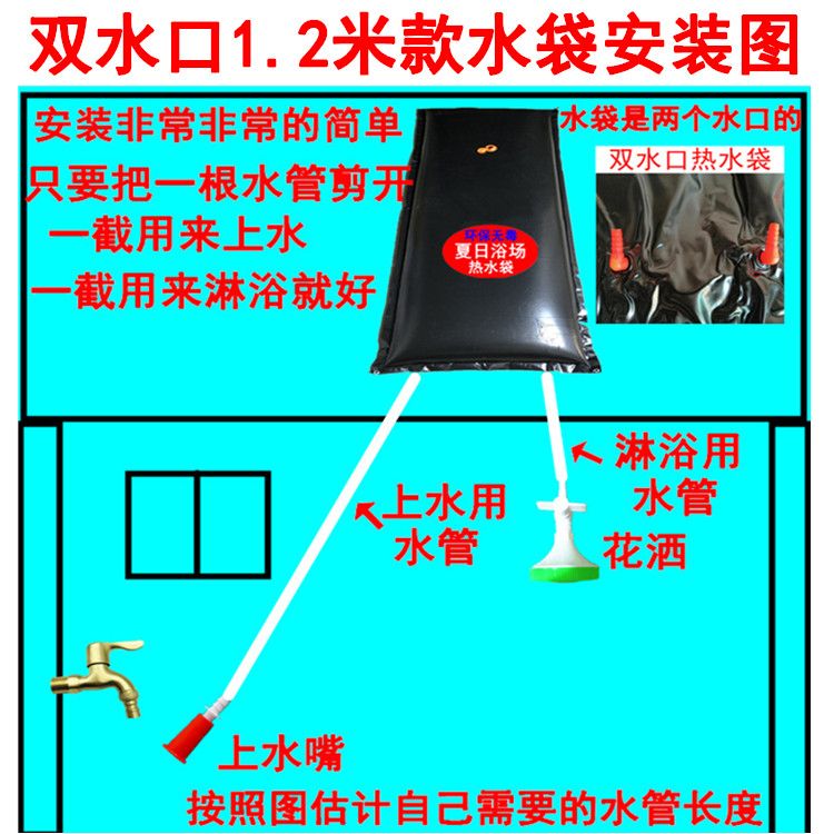 太阳能热水袋牛津加厚速热沐浴晒水袋洗澡晒水包农村夏季家用房顶 双水口1.2米款热水袋 带5米优质水管+配件