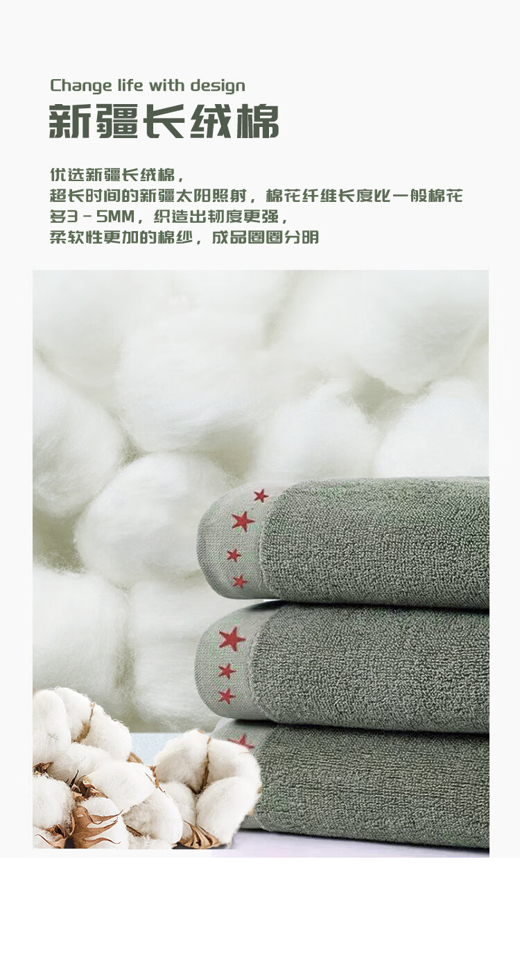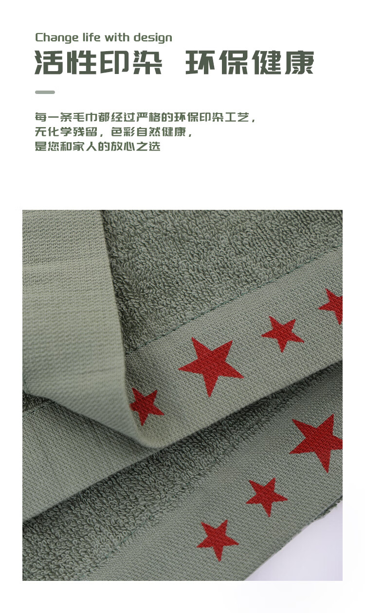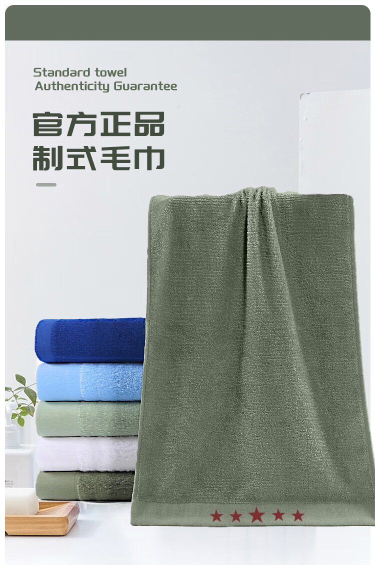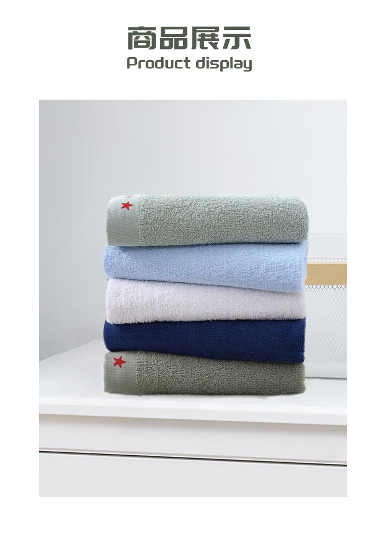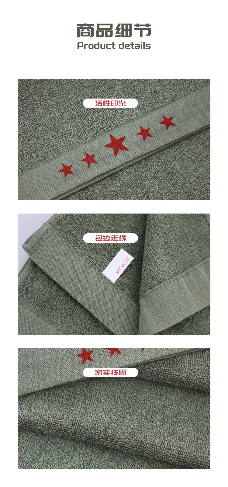神仙毛巾!质地柔软,手感很好,不掉毛不褪色,好看的五角星照亮心中的光辉感!跟以前部队发的一摸一样,下次要再多买几条,物流也很给力两天就收到了货,感谢客服小姐姐细心的解答,态度非常好~点赞