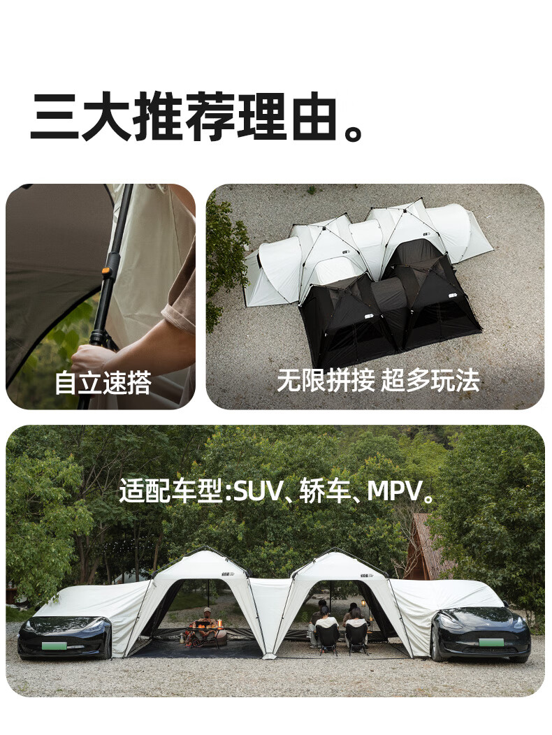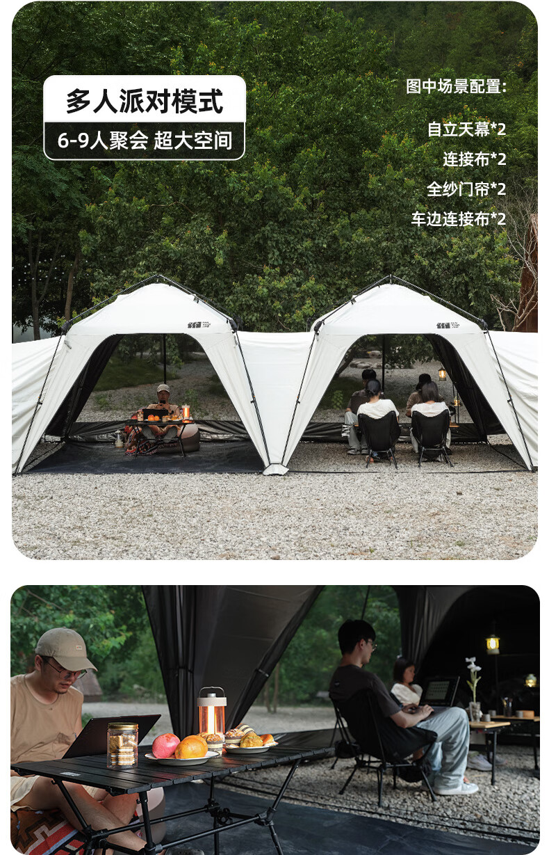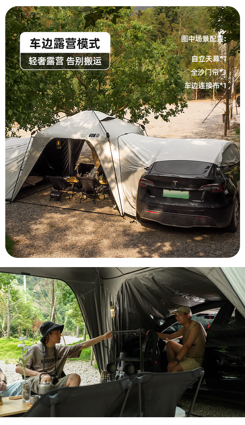 这款凉棚和连接器的组合真是自驾游的理想选择。首先,只购买凉棚和连接器就足够了,非常方便。你可以先开车去寻找心仪的风景,然后再轻松搭建棚子。对于自驾游来说,这个棚子简直是神器,车尾可以作为睡眠区,而凉棚则变成了一个舒适的休息客厅
