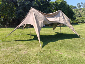 以为天幕摊开拉直了钉上地钉撑杆一撑完事,结果不是,费了一番功夫,结果搭出来是这种效果。介绍说的倒是轻松,做起来就不是那么回事了。布料厚度感觉一般,撑杆厚度感觉一般,并没有说的那么神。黑胶实际是银灰色,感觉遮阳效果还可以,其他也就那样。