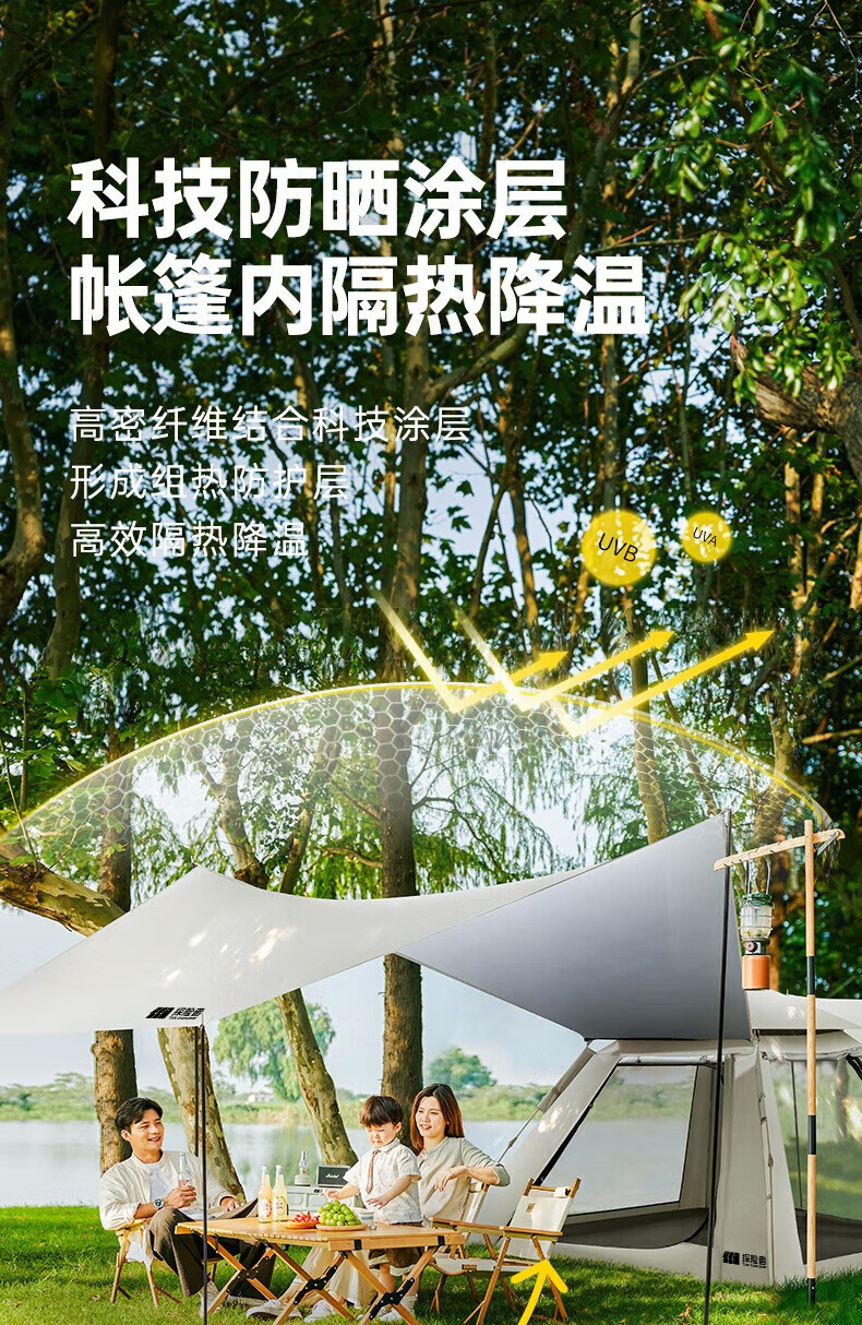 东西出乎意料的好,。拿到手的时候很惊喜!比想象中好很多;打开也没啥异味,适合家庭露营,到周末孩子?就一直缠着我带他出去玩;安装的时候很方便,两三分钟就搭完了,挺简单的,帐篷的空问 也大,孩子躺在里面还有多余的空地方,一家三口是没什么问题;遮阳效果也不错,孩子玩的很开心