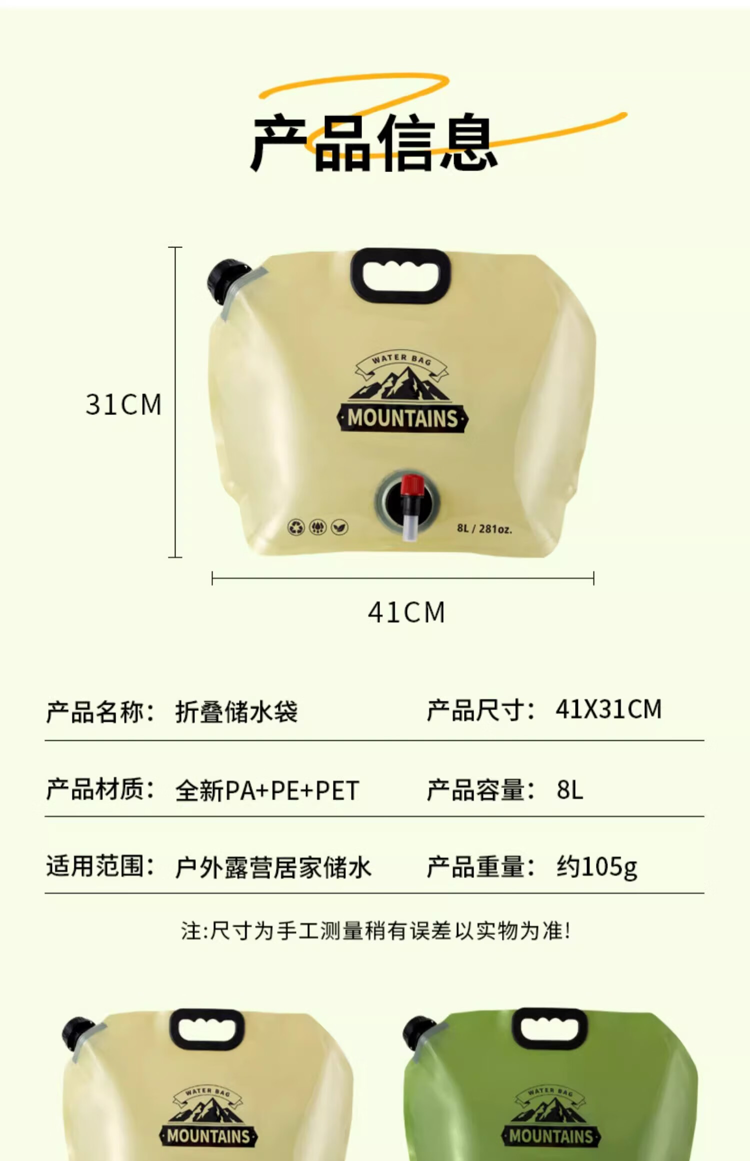这款水袋蛮厚实的,做工挺好,颜色也好看,密封性不错,装水之后不用担心会漏,折叠起来小小的很方便携带,水龙头设计不错,像一个小的饮水机。