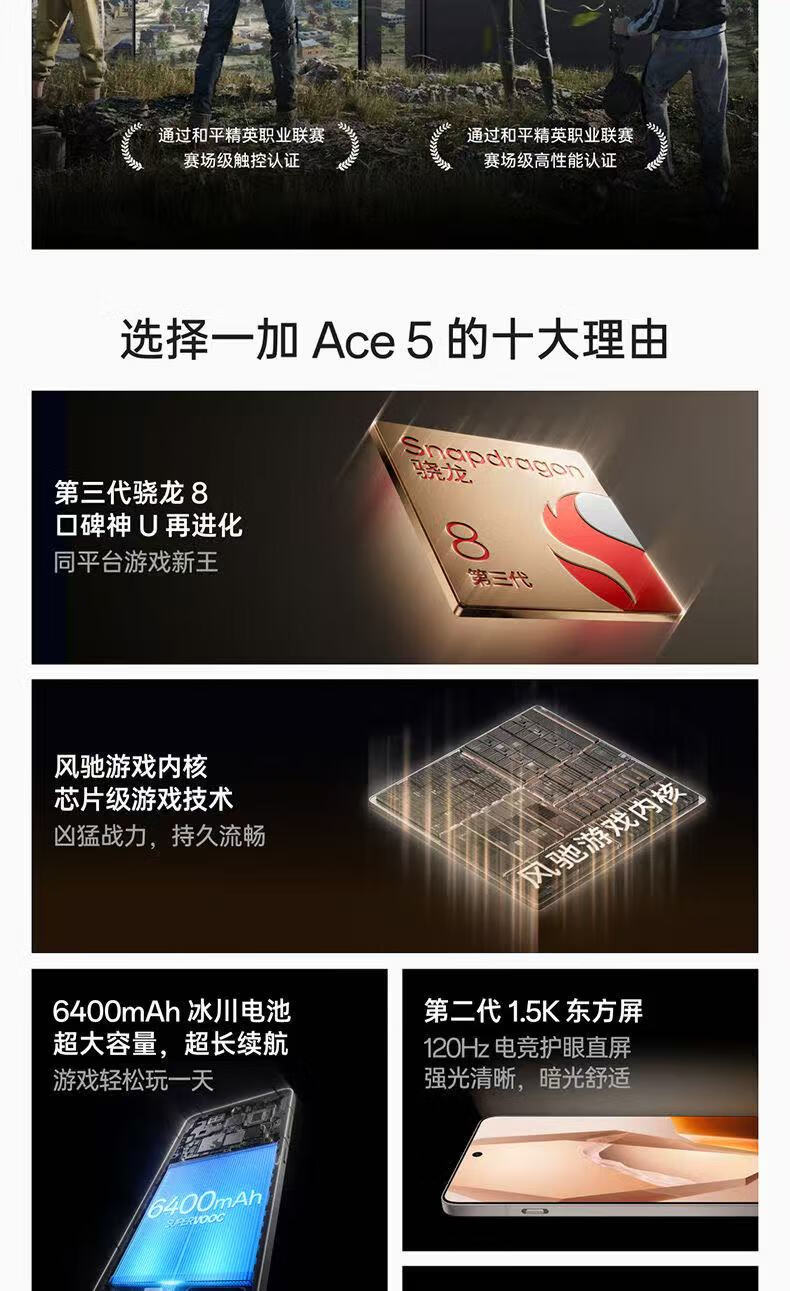 一加Ace5 游戏手机 第三代骁龙8 5G展机 性能凶猛 风驰游戏内核手机 引力钛 16GB+1TB 单机+第三方充电器+店保一年