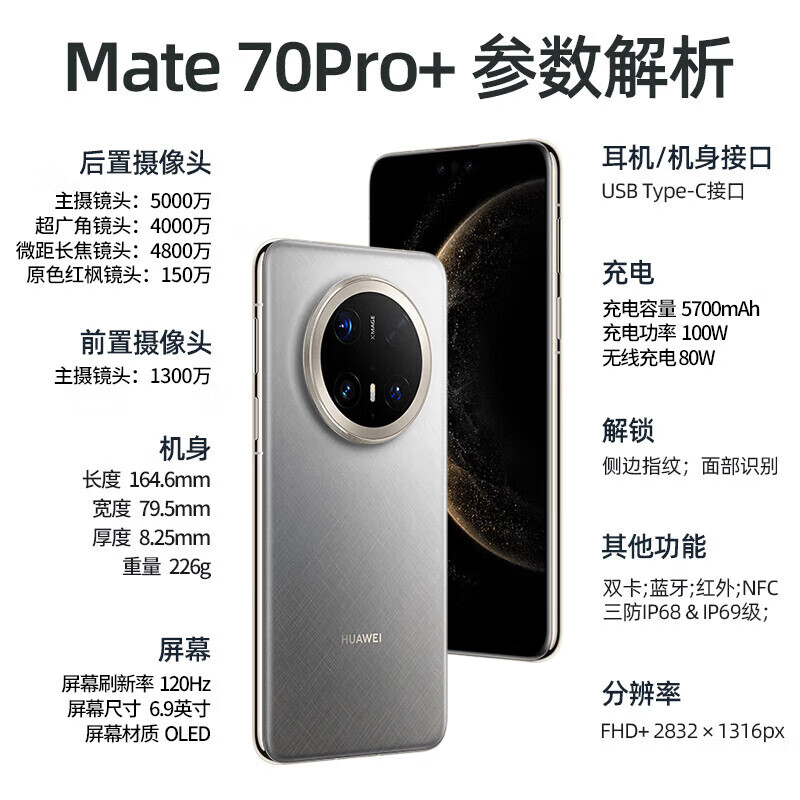 AI大模型,卫星通话,LTPO屏幕,高频PWM调光,全焦段影像,潜望式长焦,防水防尘,无线充电,NFC,红外遥控,大底主摄,等深微曲屏