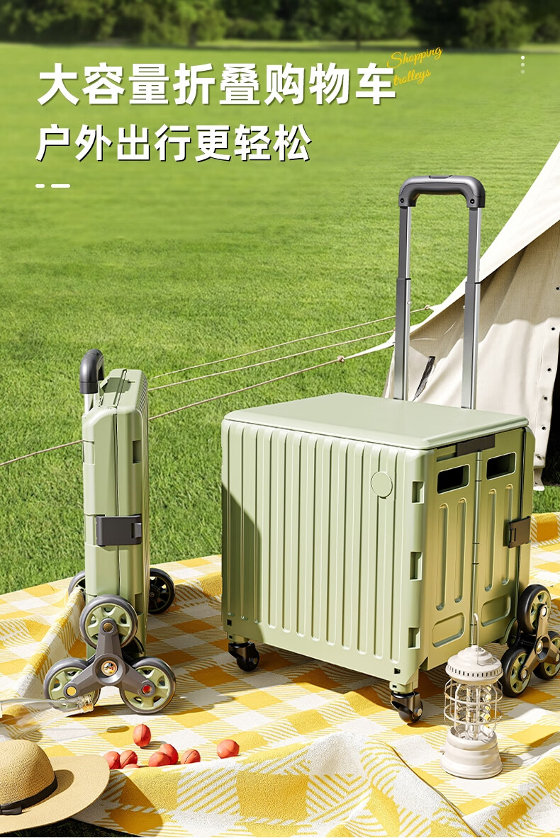 赟娅露营车户外旅行营地手拉车拉杆推车折叠野餐车购物买菜快递小拖车 【茶绿】中号-2轮-加厚斜拉款