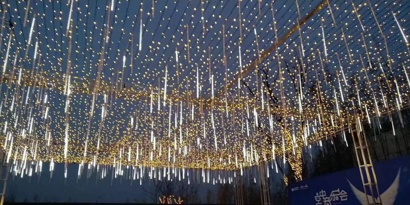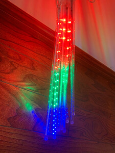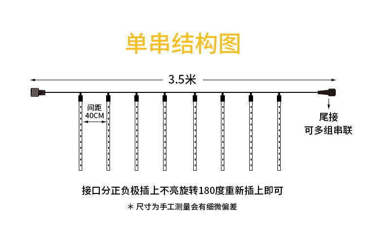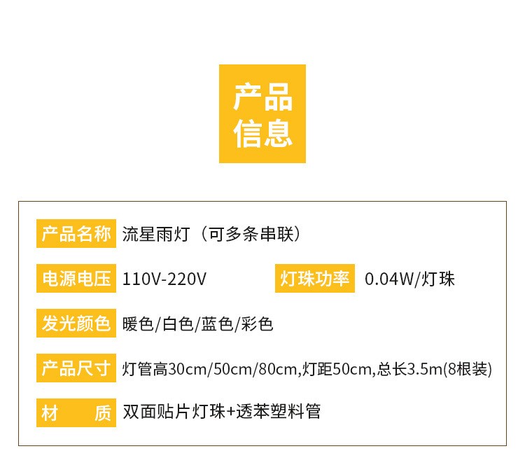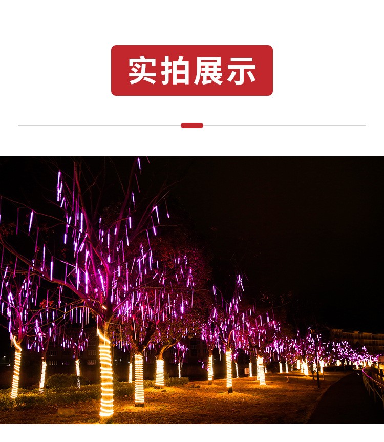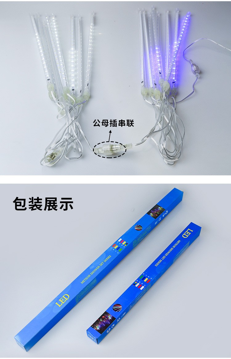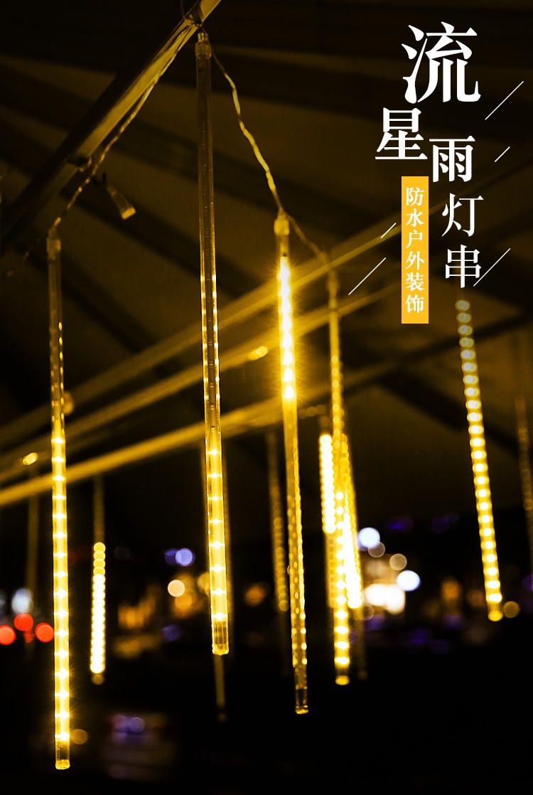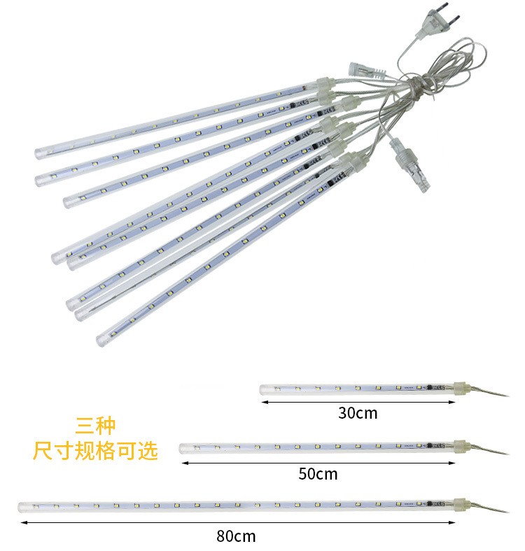 流星雨彩灯,50厘米,贴片彩灯,带尾插,可以自由延长,买了8拫,少了点,不过喜庆的气氛还是不错的,效果好线头短点,有些受限。