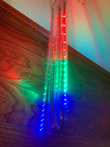 东西不错,插上就两,有红绿蓝三种颜色,看起来很炫彩,为家里平添了节日的气氛。质量也不错,虽然有一个灯条的绿色不亮,其它的都还正常,点了很多天也没有出过问题。