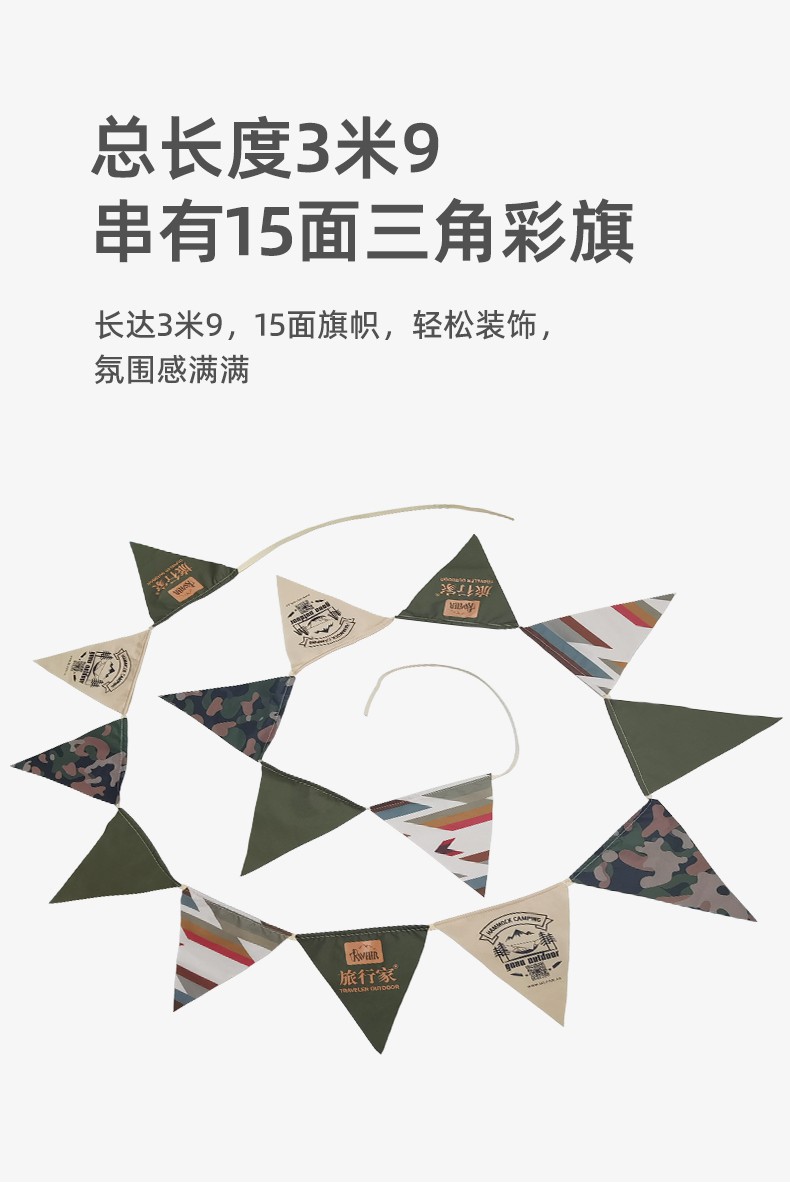 旅行家三角彩旗户外露营氛围三角旗精致野营装饰旗天幕帐篷营地彩旗子 (15面旗帜)(长度3.9米)