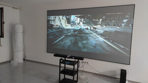 屏幕看起来很结实,配合投影仪,白天肯定不行,拉上窗帘或者晚上看很清晰,150寸也够大了,否则会很累。配合音响系统,看电影很有感觉。