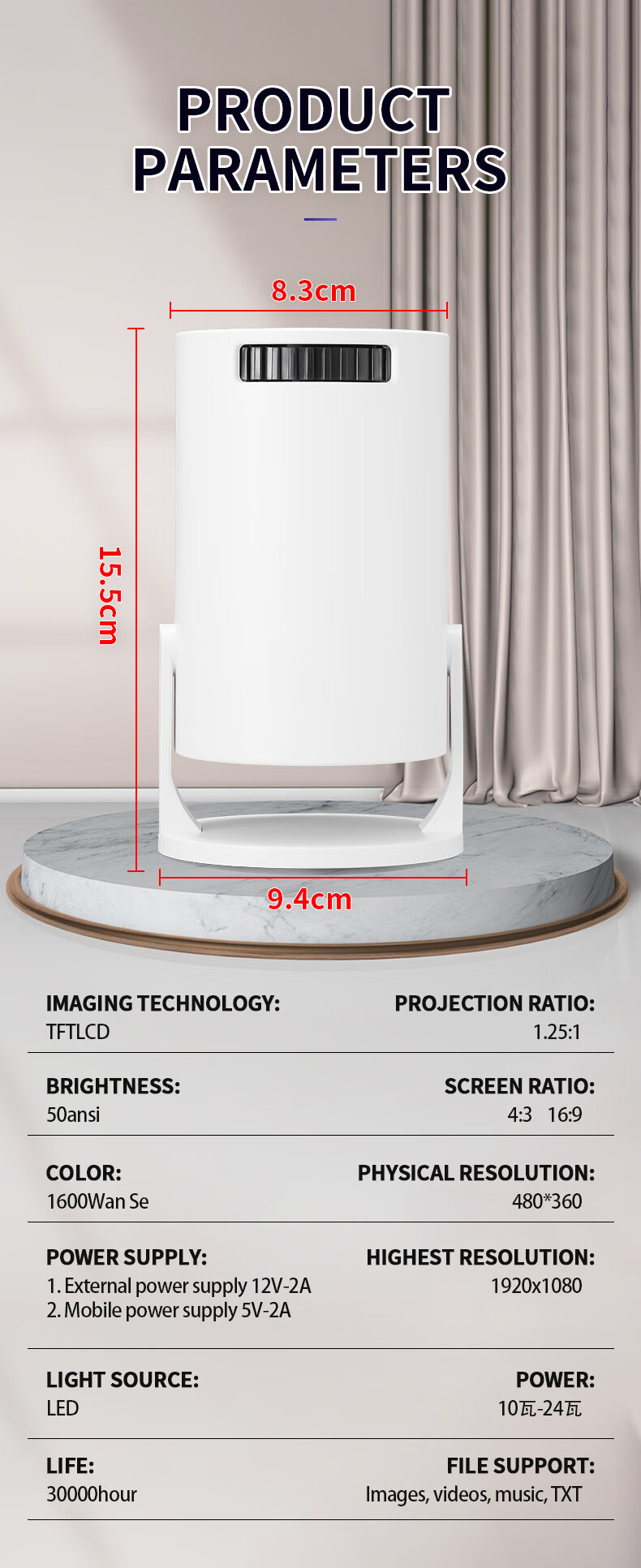 M5家用迷你投影仪小型迷你户外露营民宿便携式家庭影院投影机480P 白色(美规--12V)[国内用户选用]