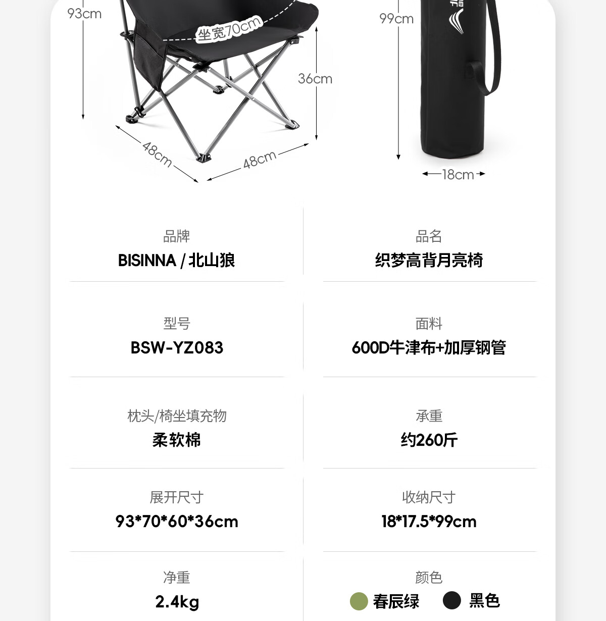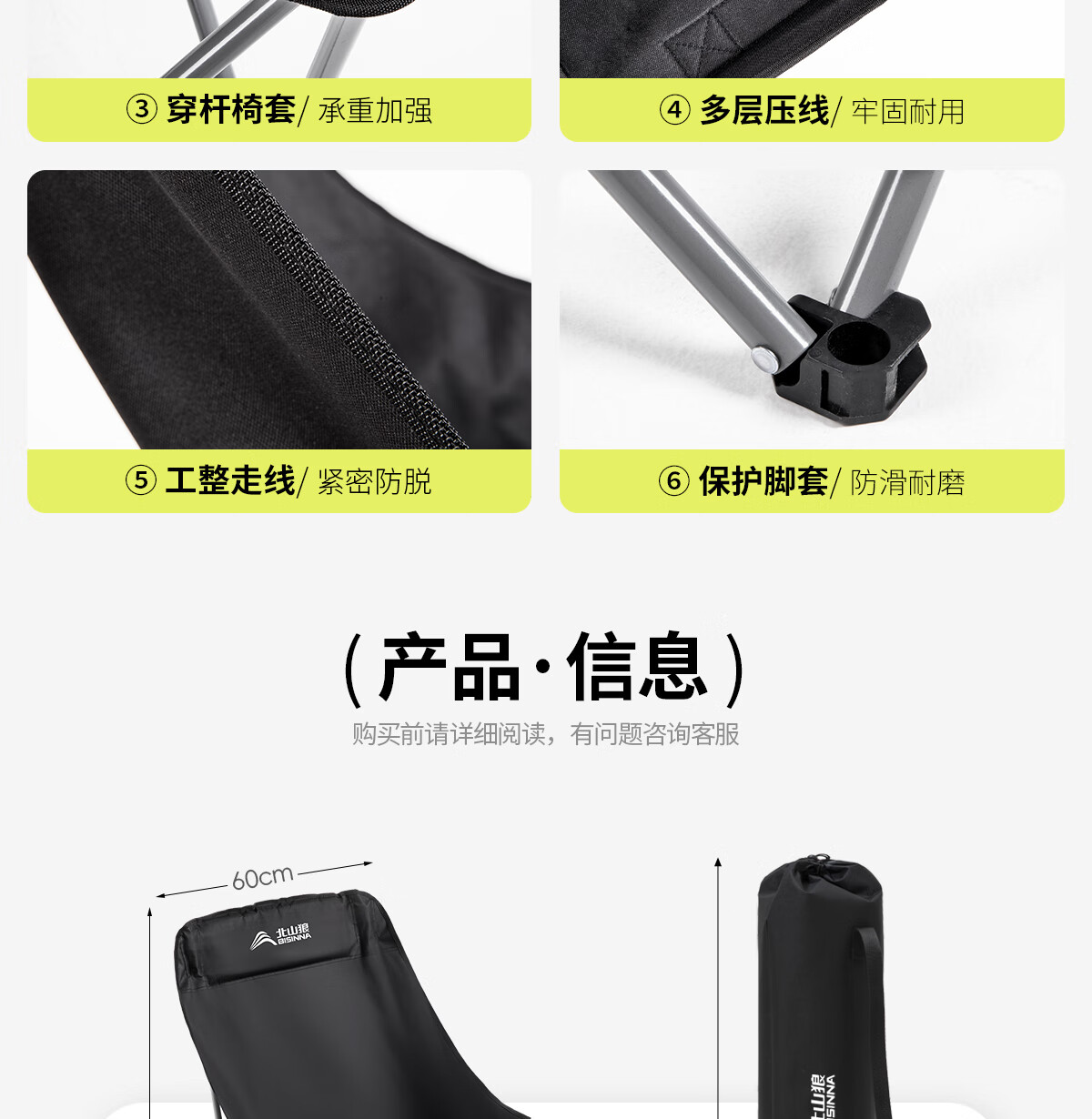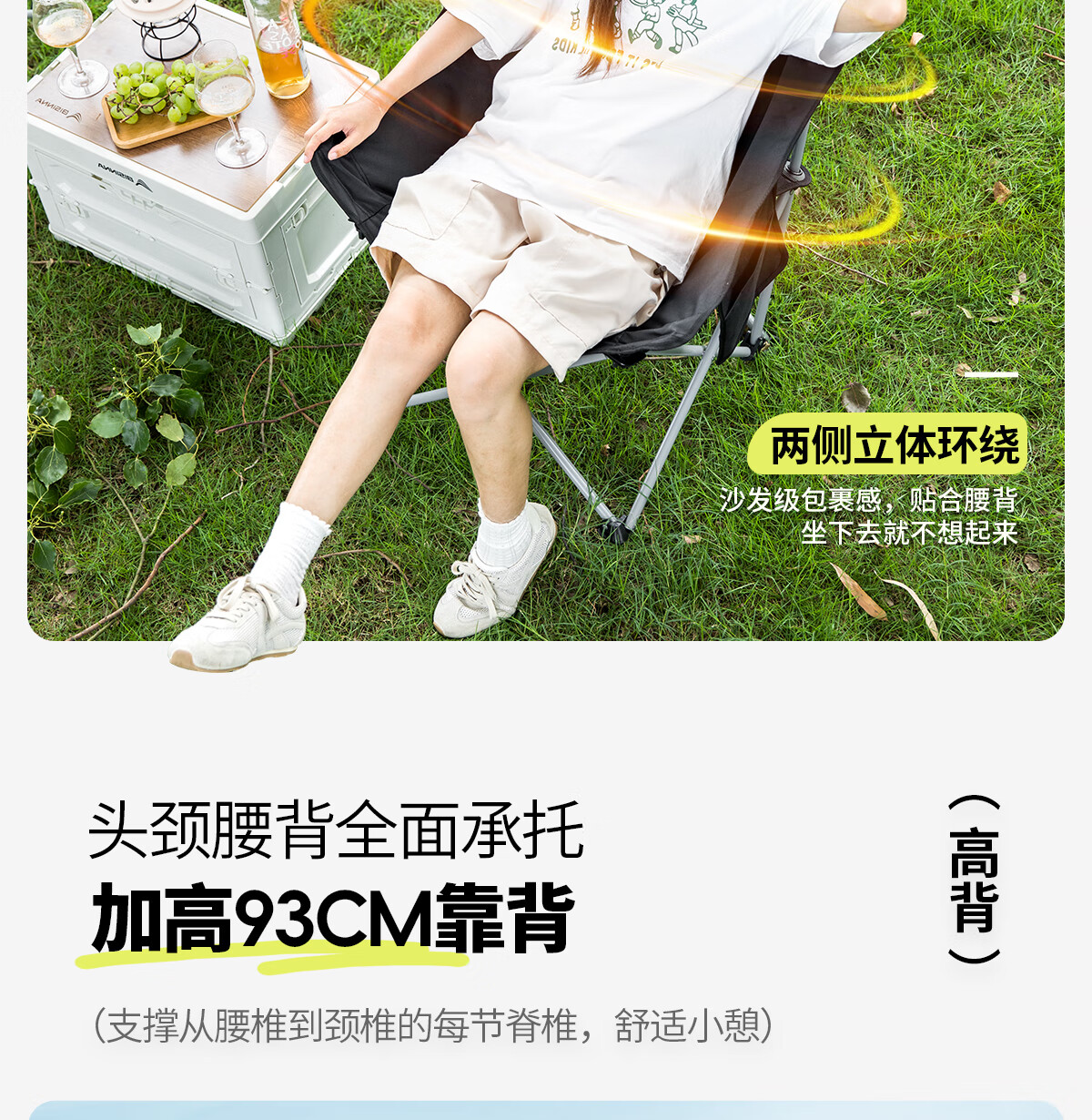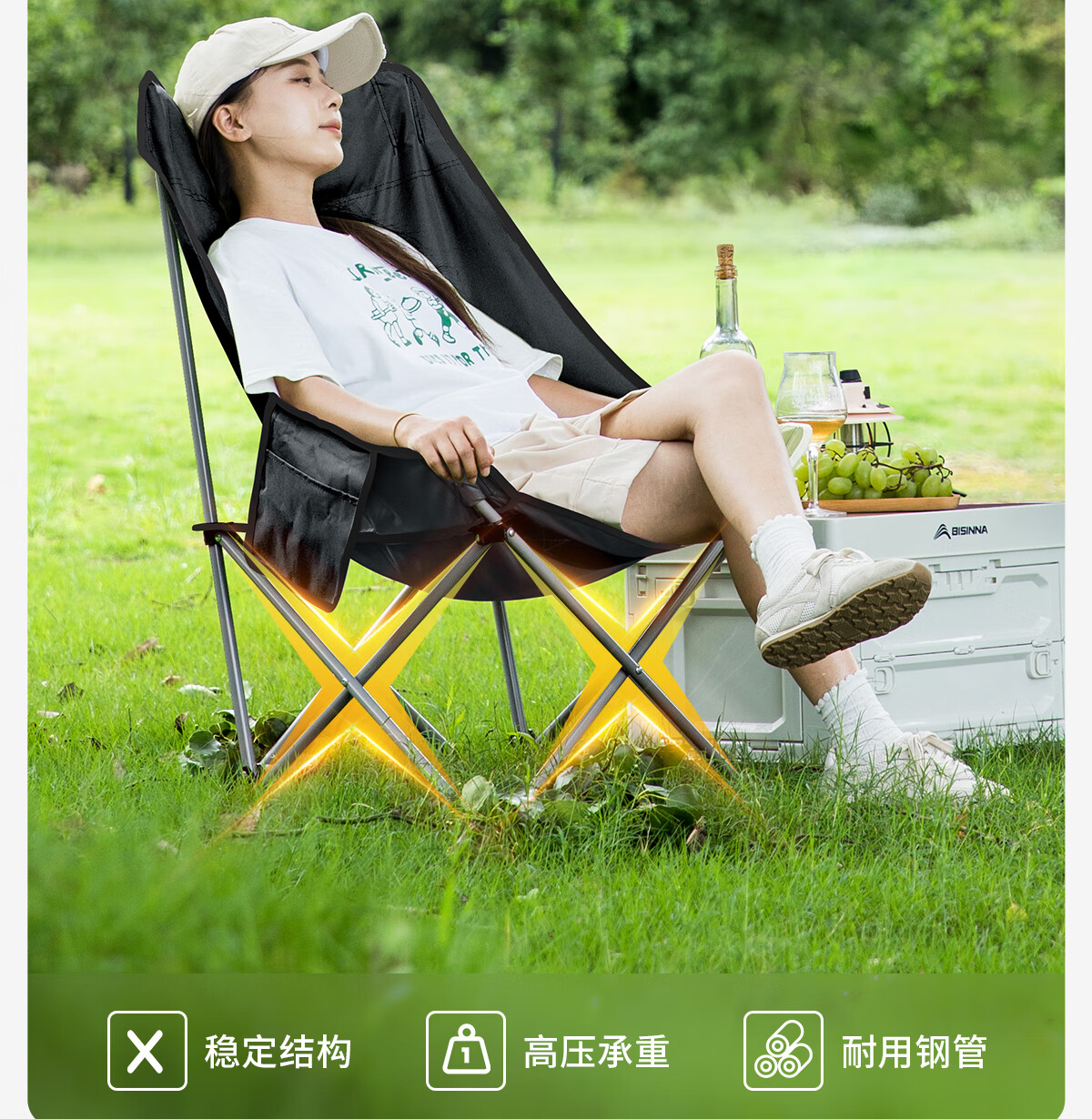 北山狼户外折叠椅 加高加宽折叠靠背月亮椅露营折叠凳便携躺椅钓鱼椅 曜石黑-高背月亮椅【加宽加高升级版】