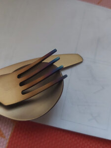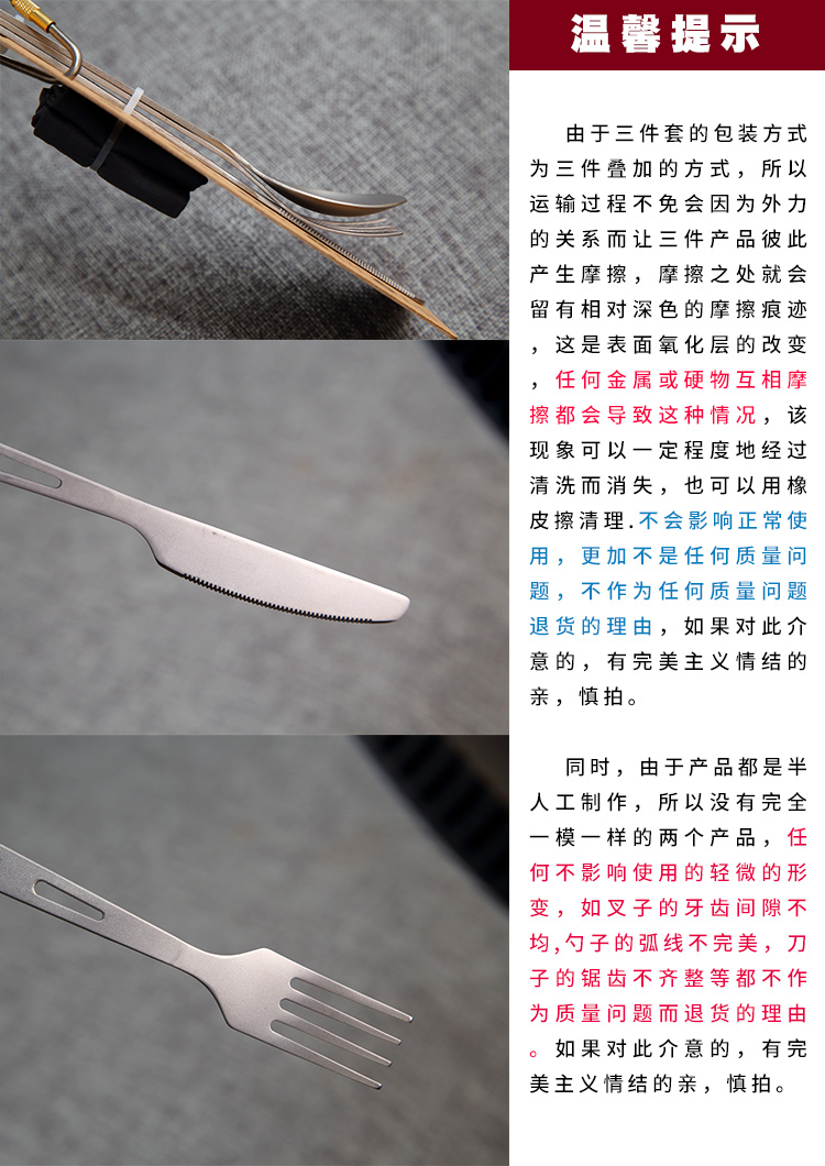 凯斯的这套餐具整体用料和做工都不错,但是运输的时候貌似互相摩擦会造成划痕,不过餐具正常使用下来都会这样,叉子变形的比较厉害,手工掰直了。