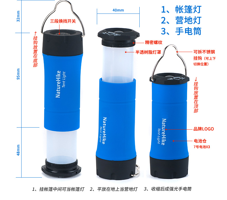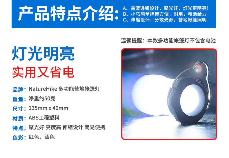 NatureHike挪客 露营帐篷灯 户外野营灯led 多功能三合一营地照明灯 蓝色