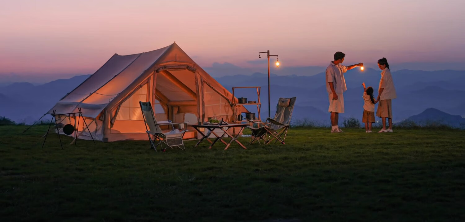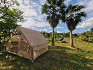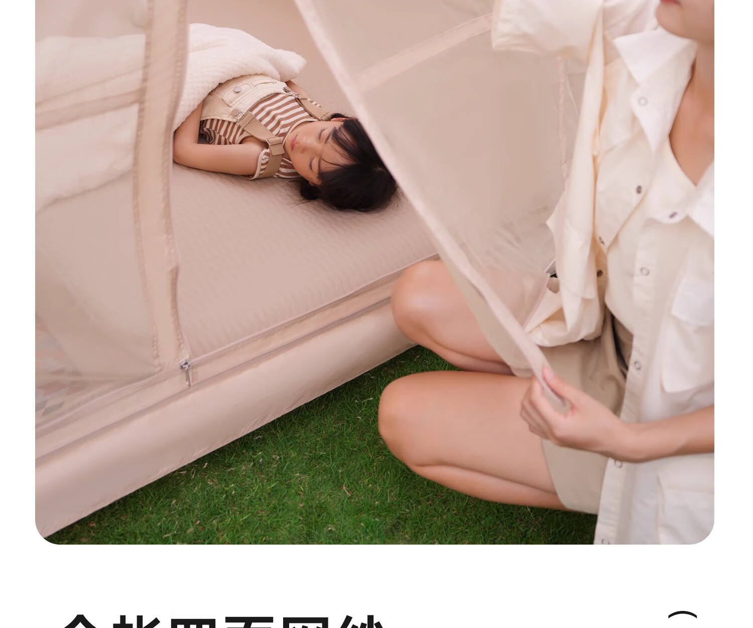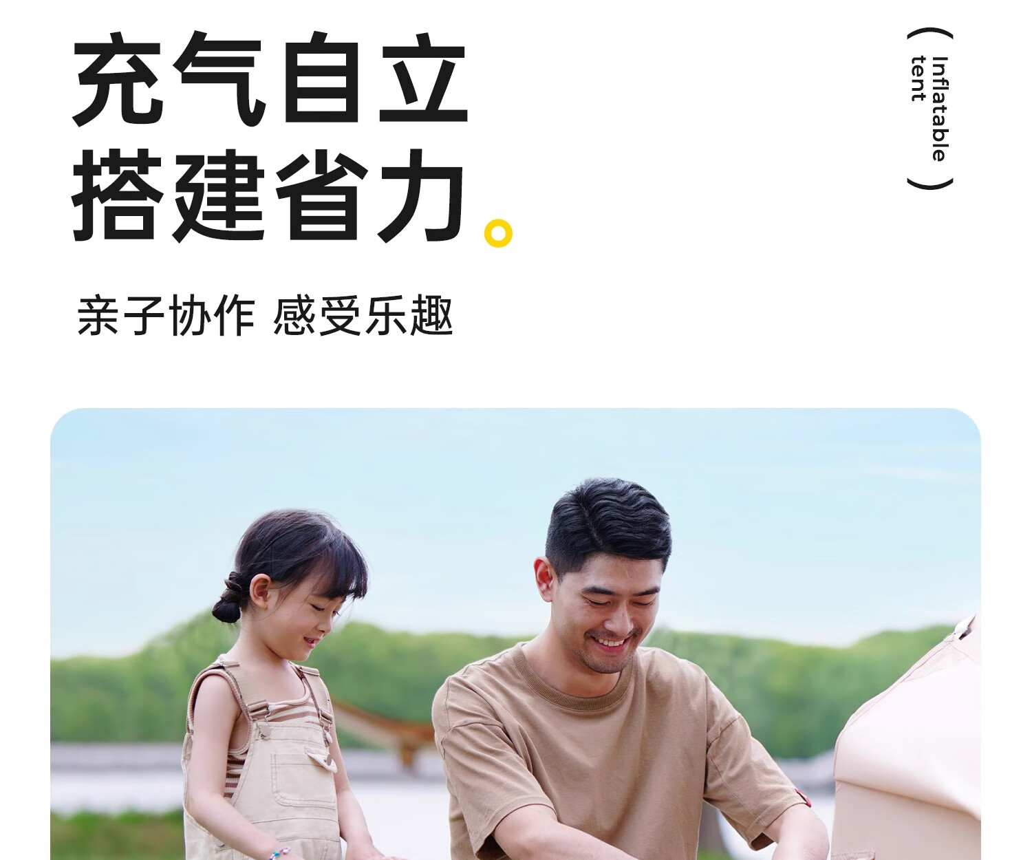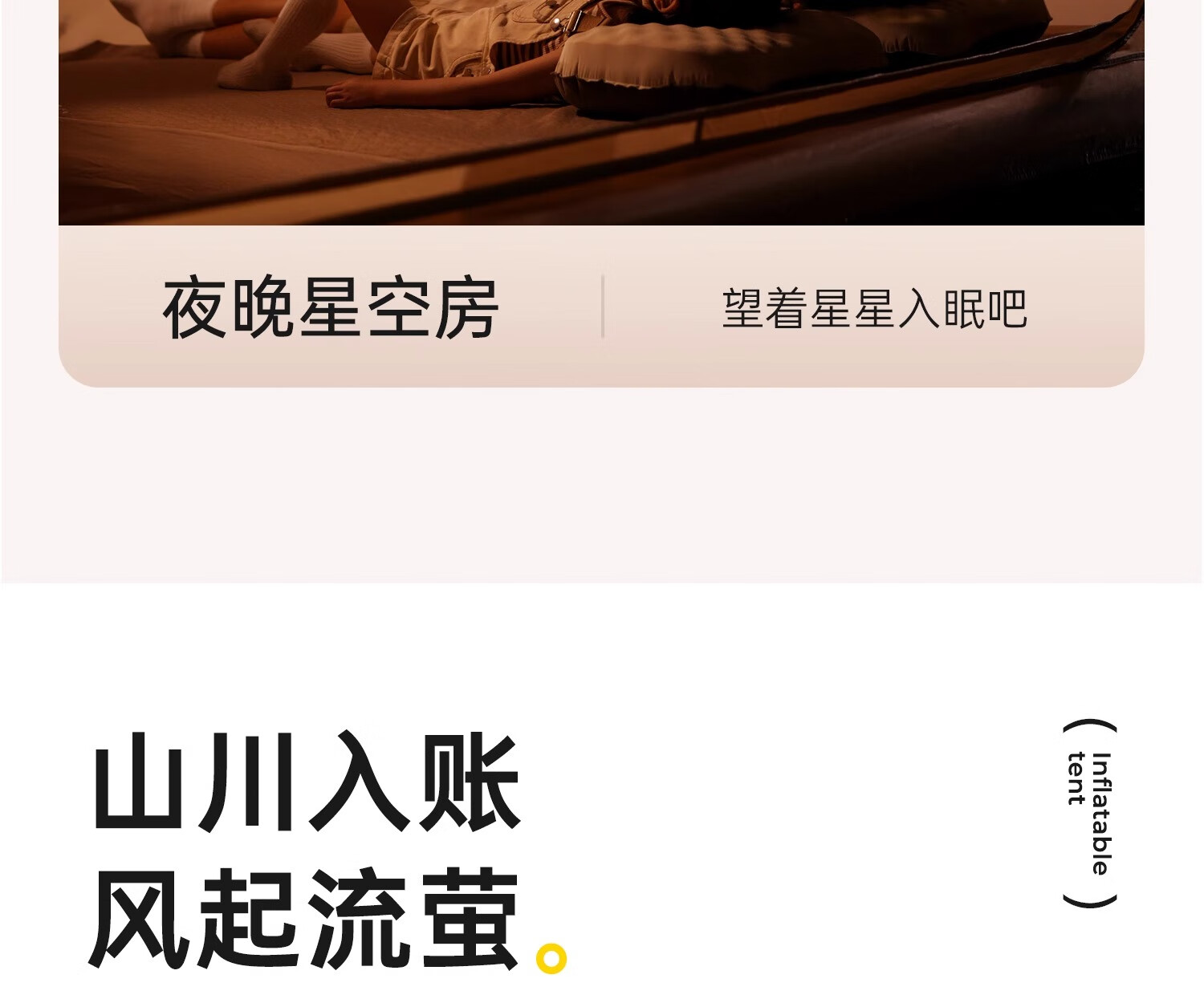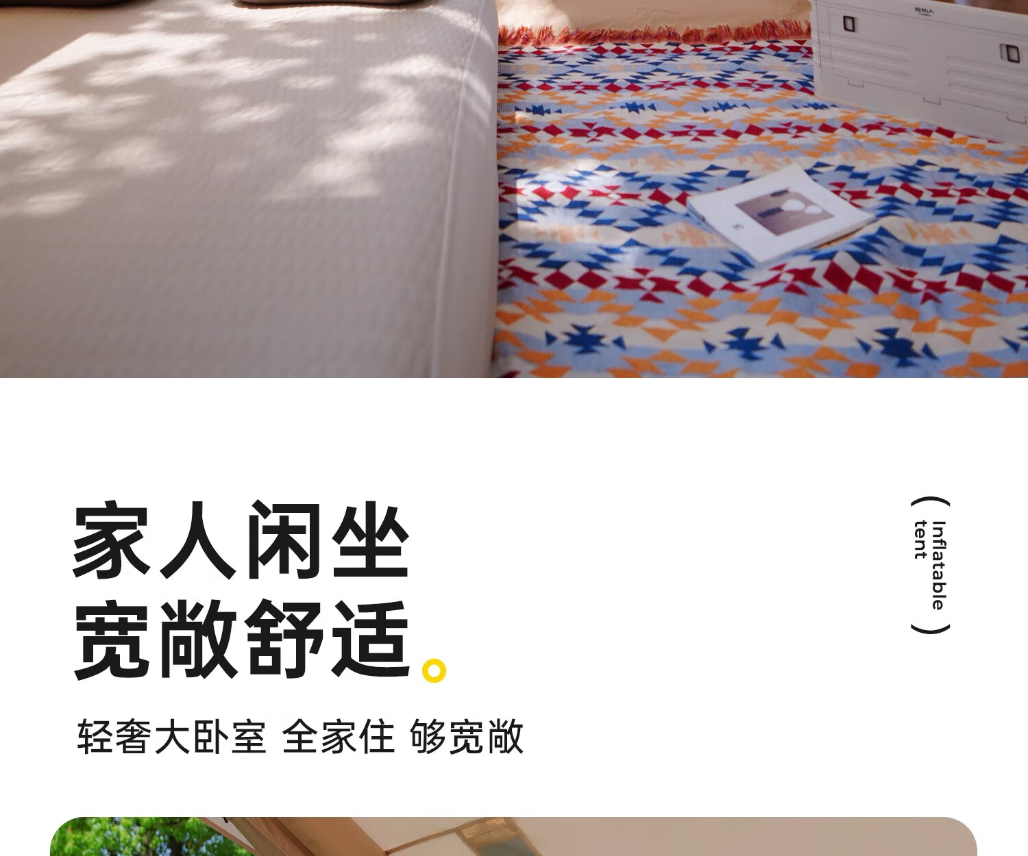 适合户外露营,布料厚实,安装快捷方便,充气很快,几分钟就搞好了,颜值高,非常nice,好看的很呢。过夜很舒服,防水防雨防风,很稳固的