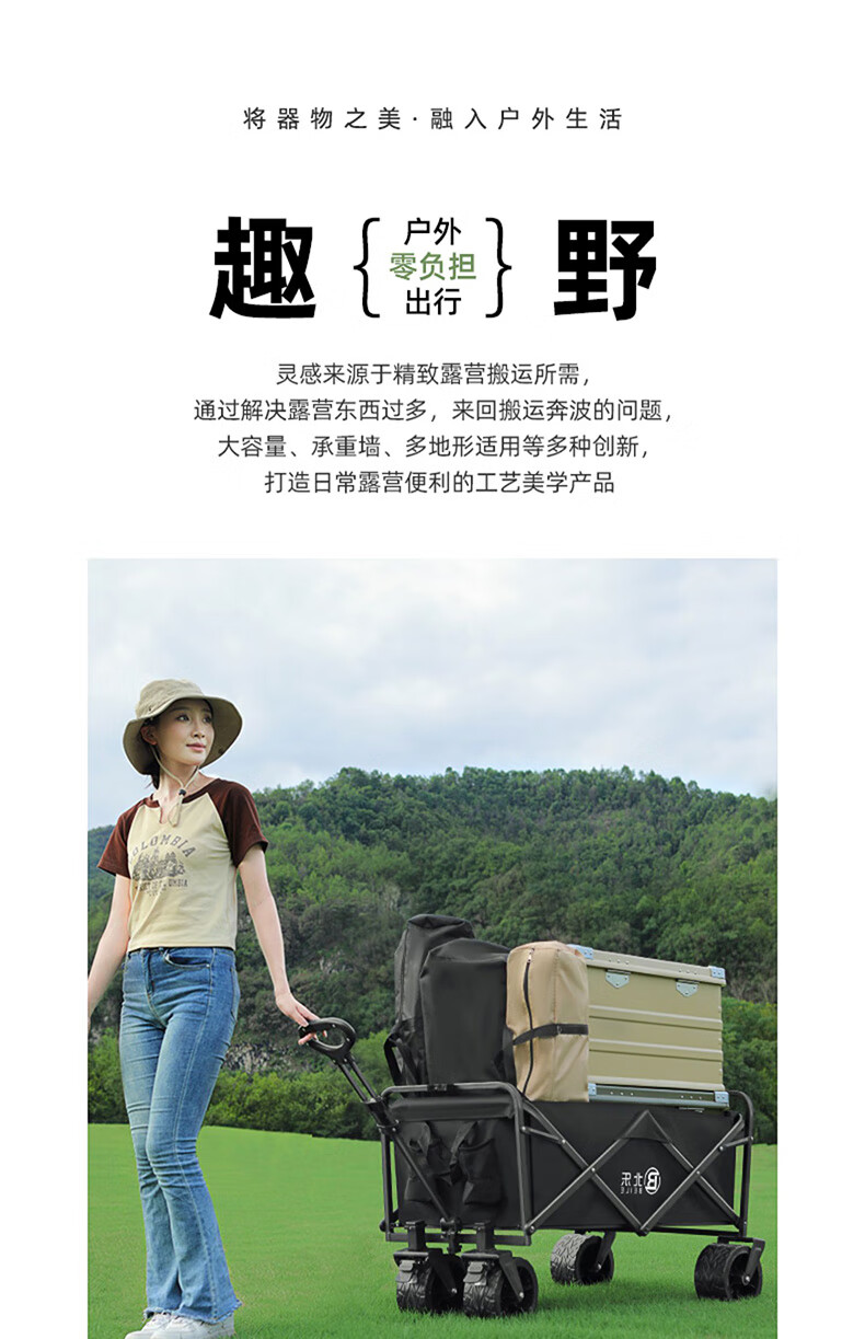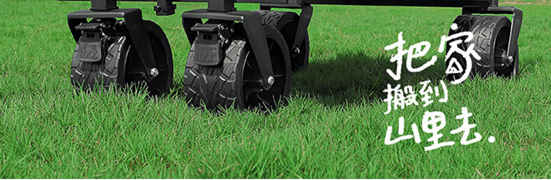 车子比较大,应该可以装比较多的东西,有桌板的设计,所以可以减少那种所谓的露营场景的桌子需求。对于露营场景不在乎就是装椅子、烤箱或者简易炉灶、天幕或者简易帐篷什么,是装的下的。轮子比较粗大,就是商家所谓的坦克轮把,过那种湿软的地段可能有帮助,关键是带刹车,可以当桌子使用的时候提供稳定性。