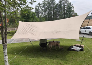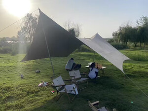 很好用的天幕,中午呆在天幕下也不怎么热。应付中小雨完全没问题。撑杆硬朗结实,高度很好,不压抑