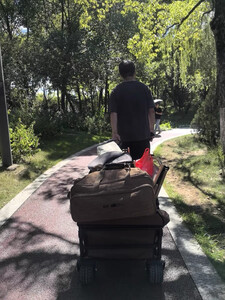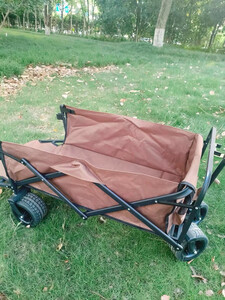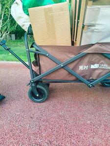 本来还担心露营车不好推行,没想到它的超大越野轮轻松就应对了这种复杂地形。轮子的减震效果也超棒,哪怕装满了东西,推行起来也很平稳,完全不用担心车里的食物和物品会被颠坏。上次我们带着孩子一起露营,孩子坐在里面,一路都稳稳当当的,开心得不行。而且轮子的材质很耐磨,用了好几次,几乎没有什么磨损,质量真的没得说。