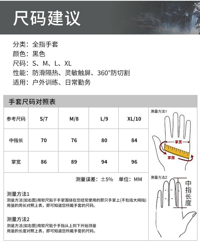 金格羽户外5级防割防刺战术手套全指男作战格斗防身骑行登山手套 京仓