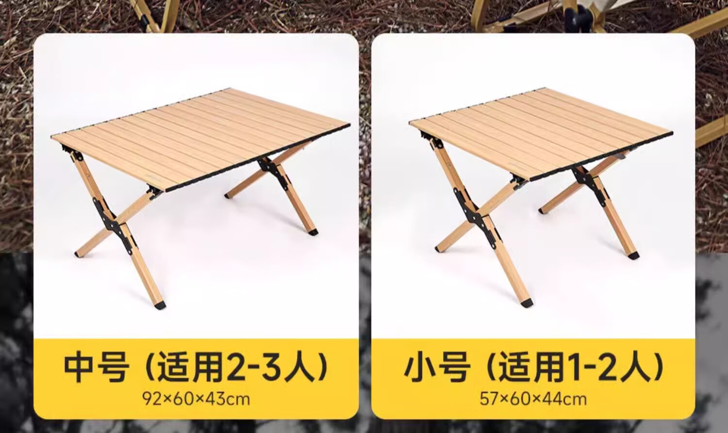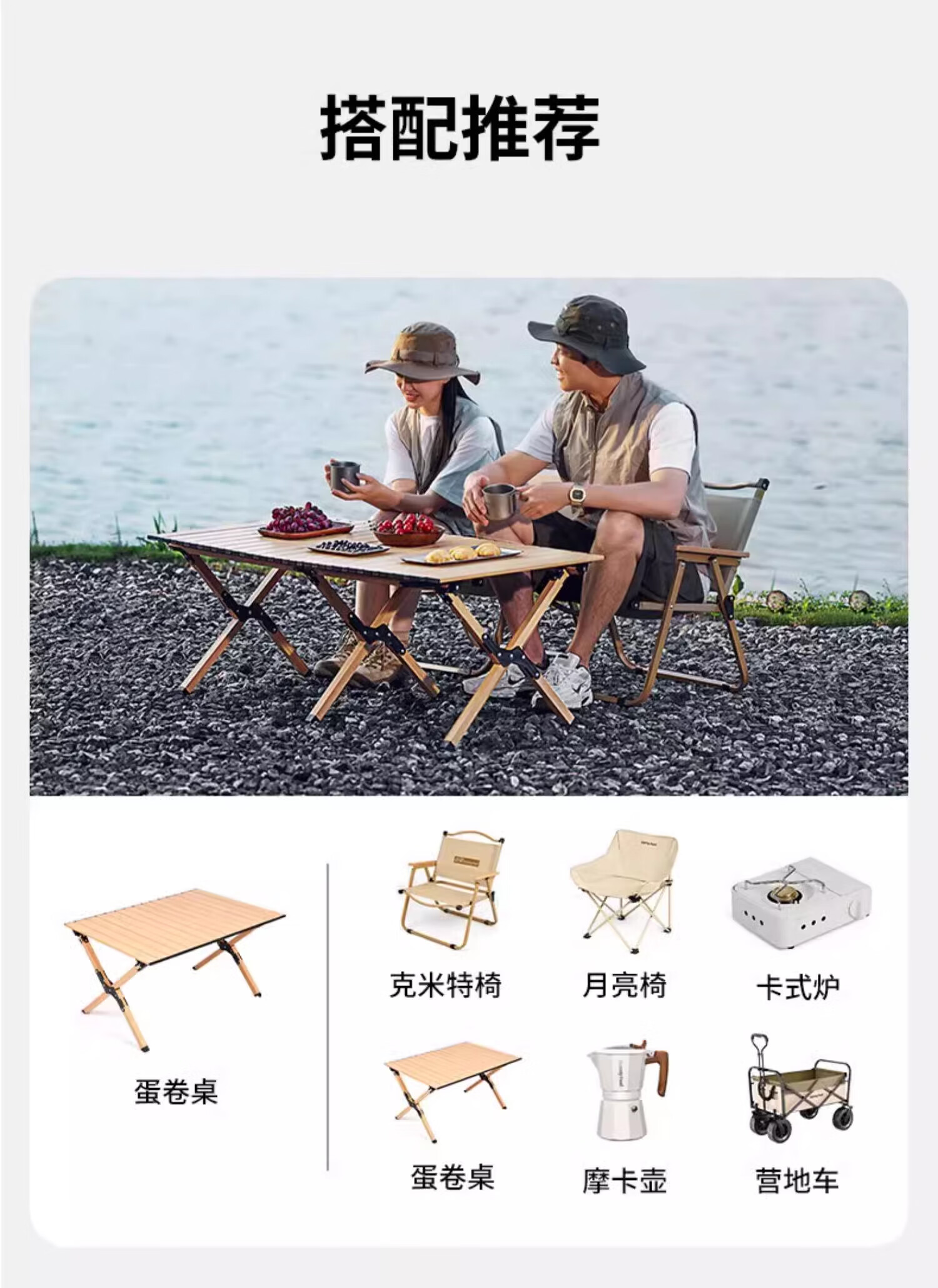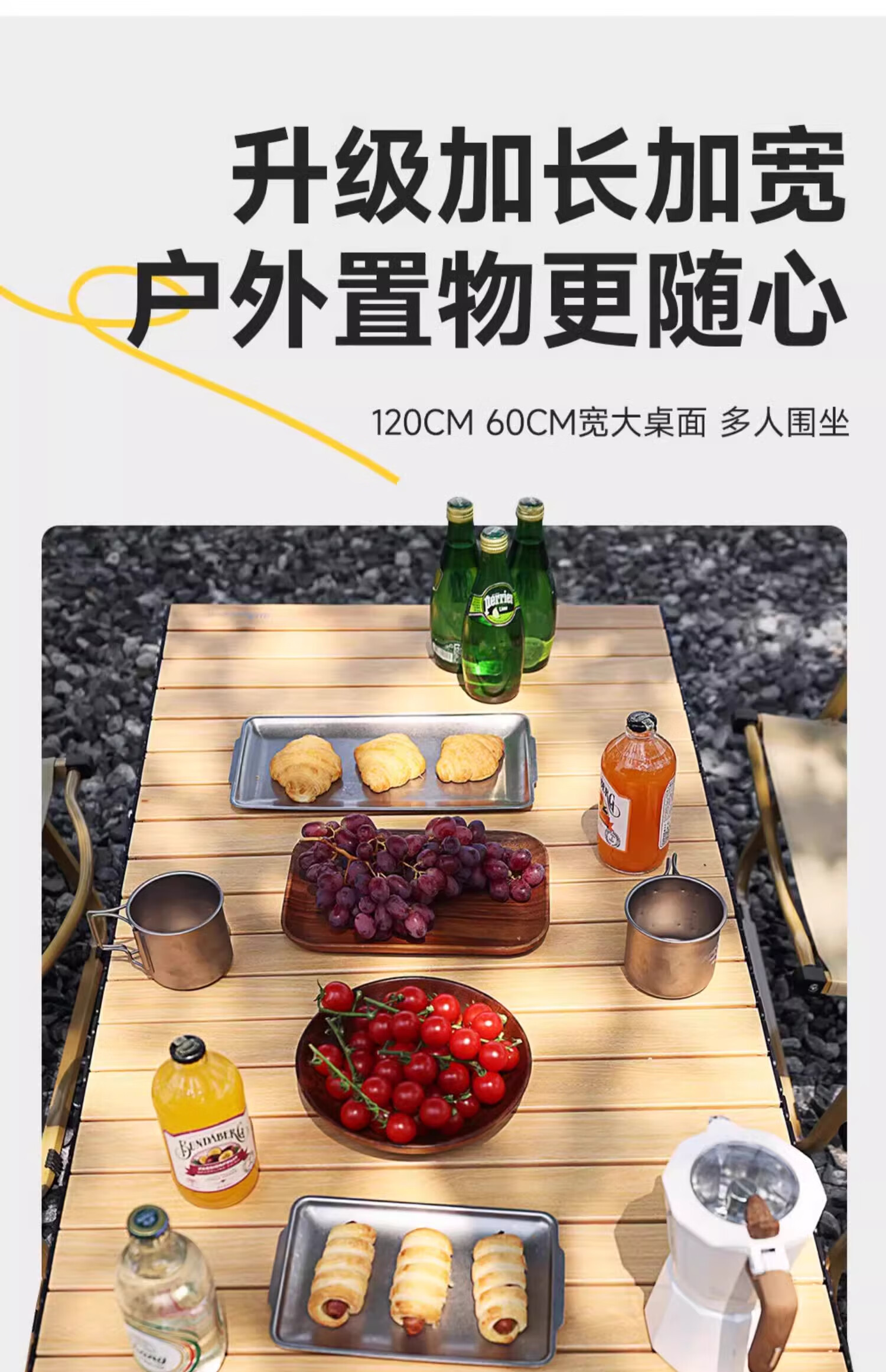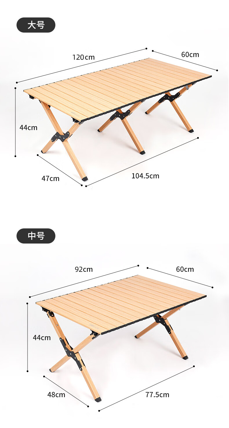 这款蛋卷桌尺寸适中,非常适合户外露营使用。一米二的长度可以放置许多物品,双面桌面,折叠设计收放方便,三角形支架稳定,围坐4~6人刚刚好,高度适中,小巧便携。