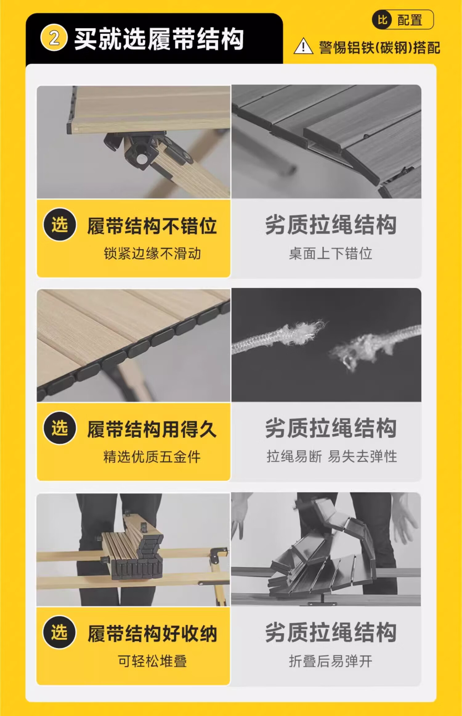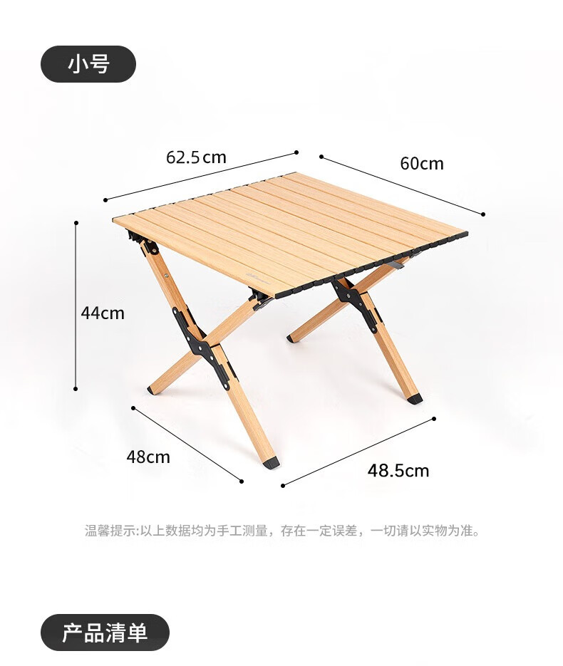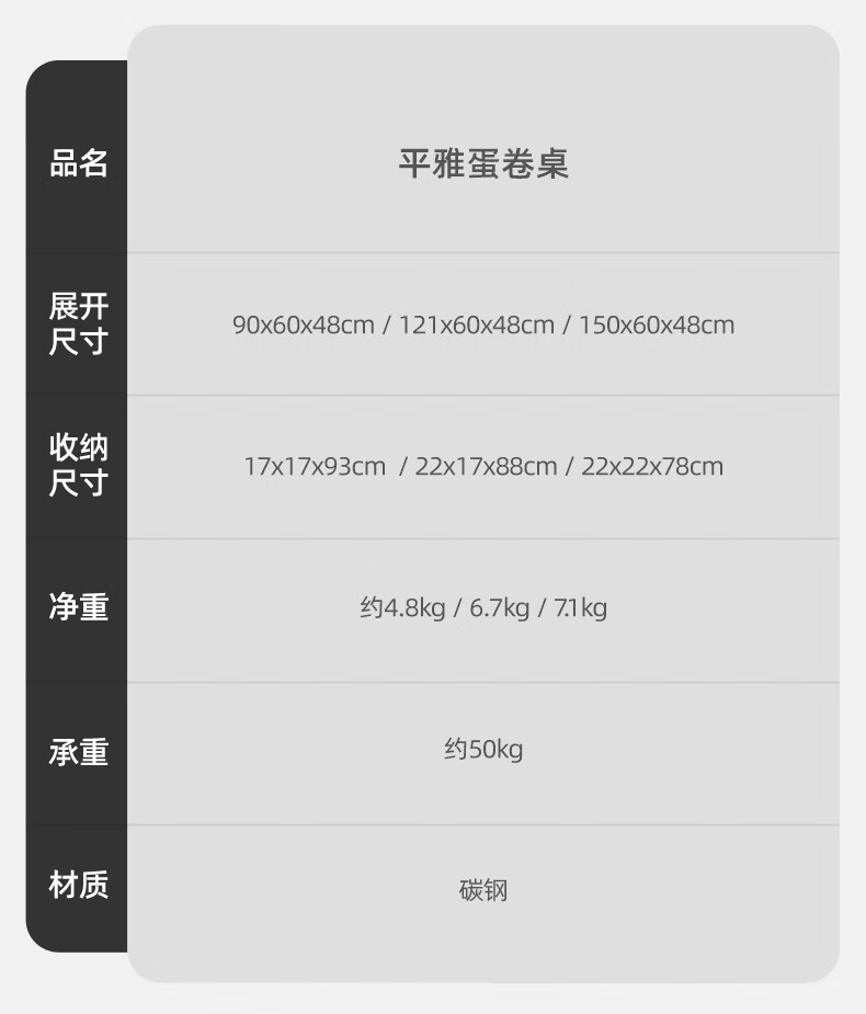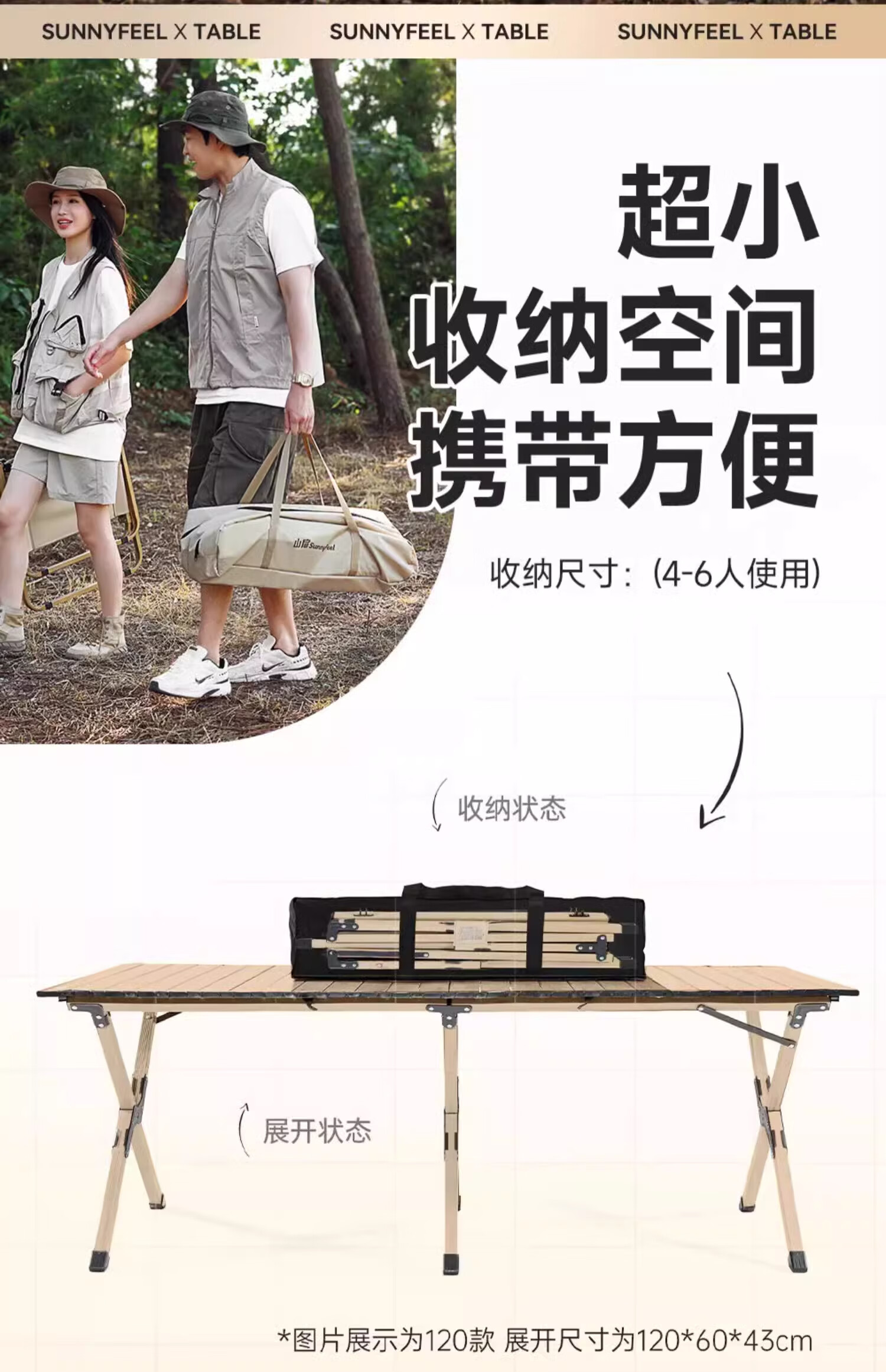 这款蛋卷桌尺寸适中,非常适合户外露营使用。一米二的长度可以放置许多物品,双面桌面,折叠设计收放方便,三角形支架稳定,围坐4~6人刚刚好,高度适中,小巧便携。
