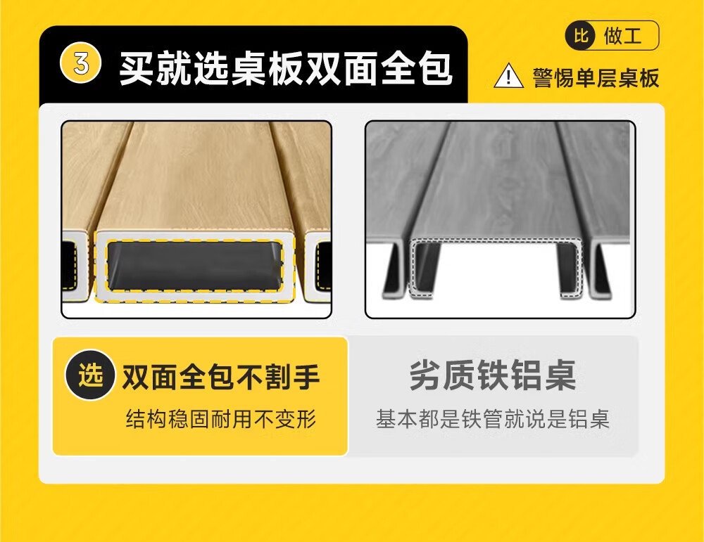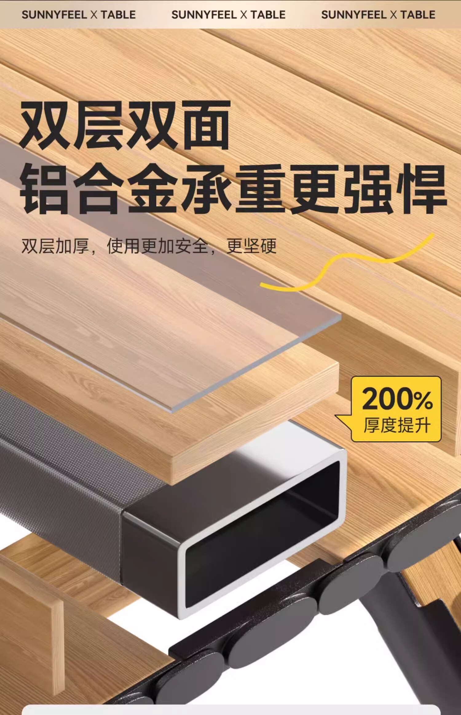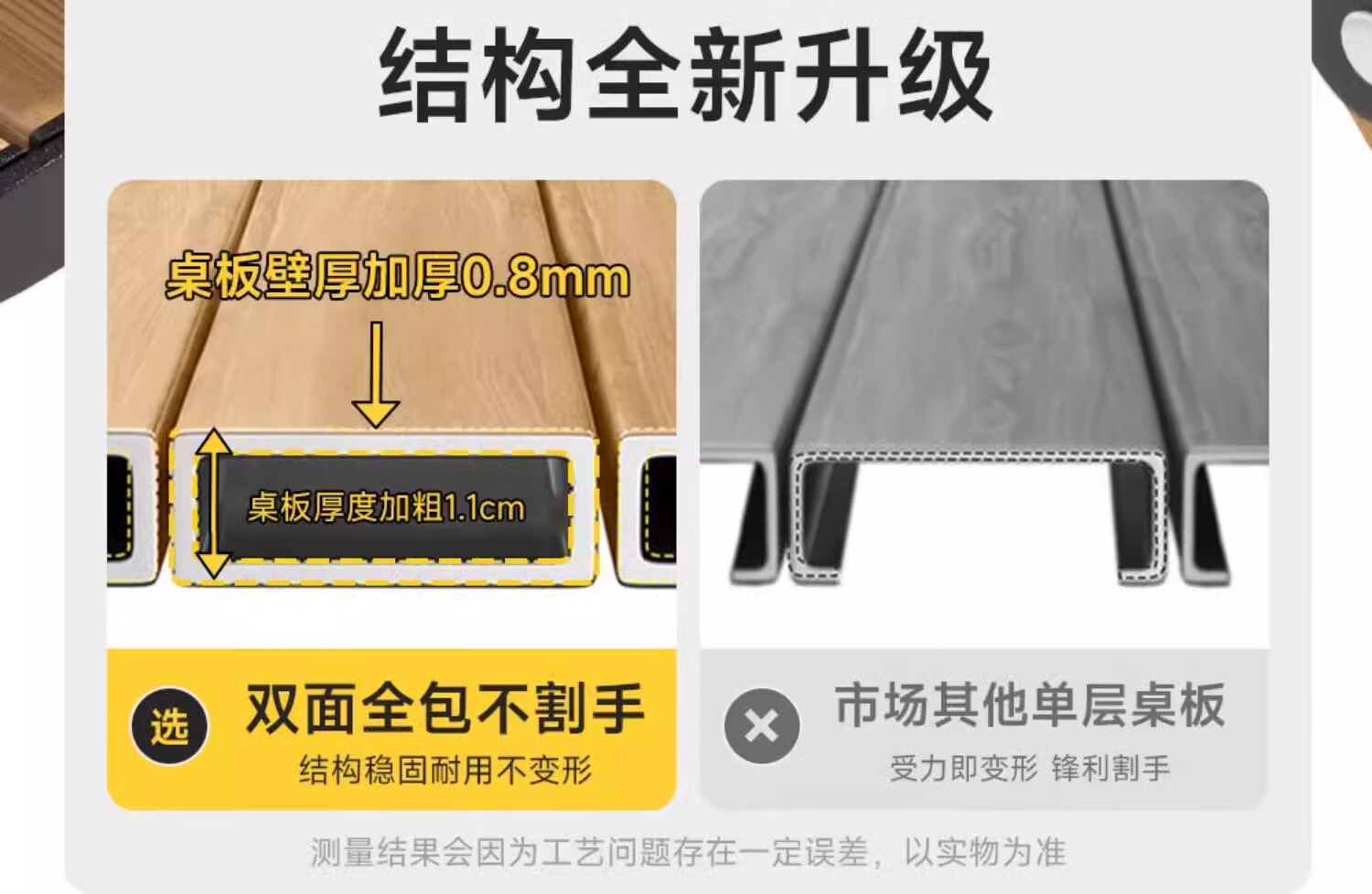 真双面铝桌面,真2.5cm 支架,真加固加强五金连接件,真羊蹄 脚,真快拆定位卡扣,真坦克履带铰链。物有所值。客服服务态 度也很好!好评!