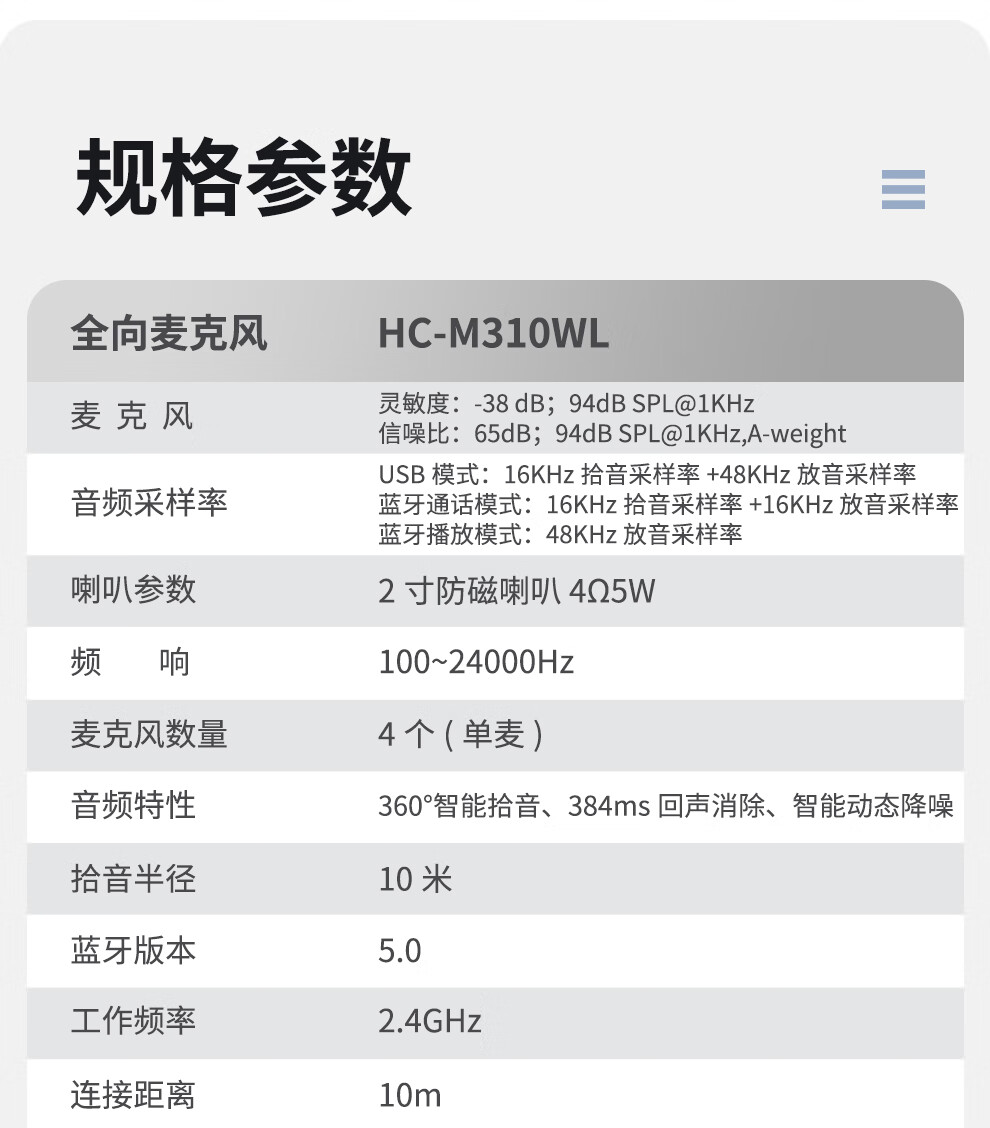 华畅视讯视频会议全向麦克风USB蓝牙无线阵列拾音器ZOOM腾讯会议设备级联一拖二三四5.8G桌面扬声器 HC-M10U(USB有线+无音箱)
