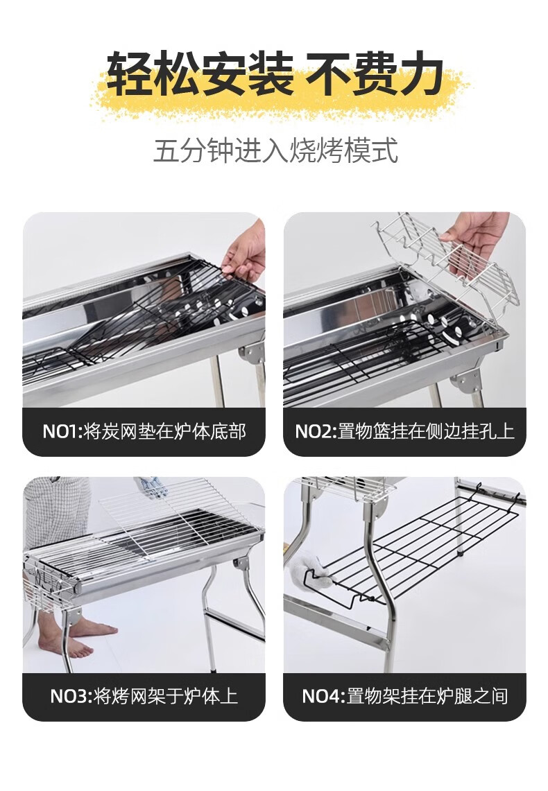 烧烤炉烤炉烧烤架家用户外折叠便携式全套工具庭院不锈钢加厚烤肉 大号折叠款【食品级不锈钢网】+5配件