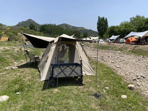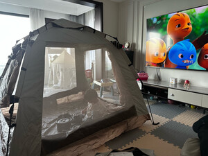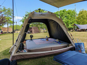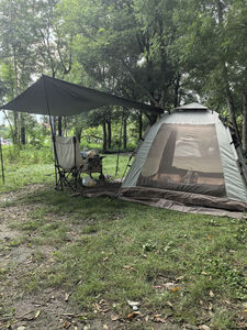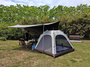 买回来的第一个礼拜就让老公带着自己和宝宝出去露营了,比以前的帐篷空间大多了,而且带天幕使用起来就更加方便了,一个人搭也也很方便,颜色也很漂亮,大大的落地窗,帐篷里的通风也很好