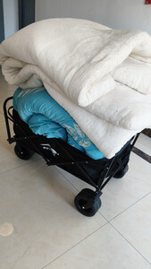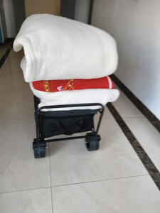 最近搬家,有些东西拿着不方便,就买了这个小推车,不错,轮胎质量很好,也有刹车,不至于斜坡路段担心滑走,容量也挺大的,唯一美中不足的就是拐弯时候感觉不是很灵活,其他都挺好的,总体来说满意!留着以后宝宝大一些啦还能坐进去拉着出门!