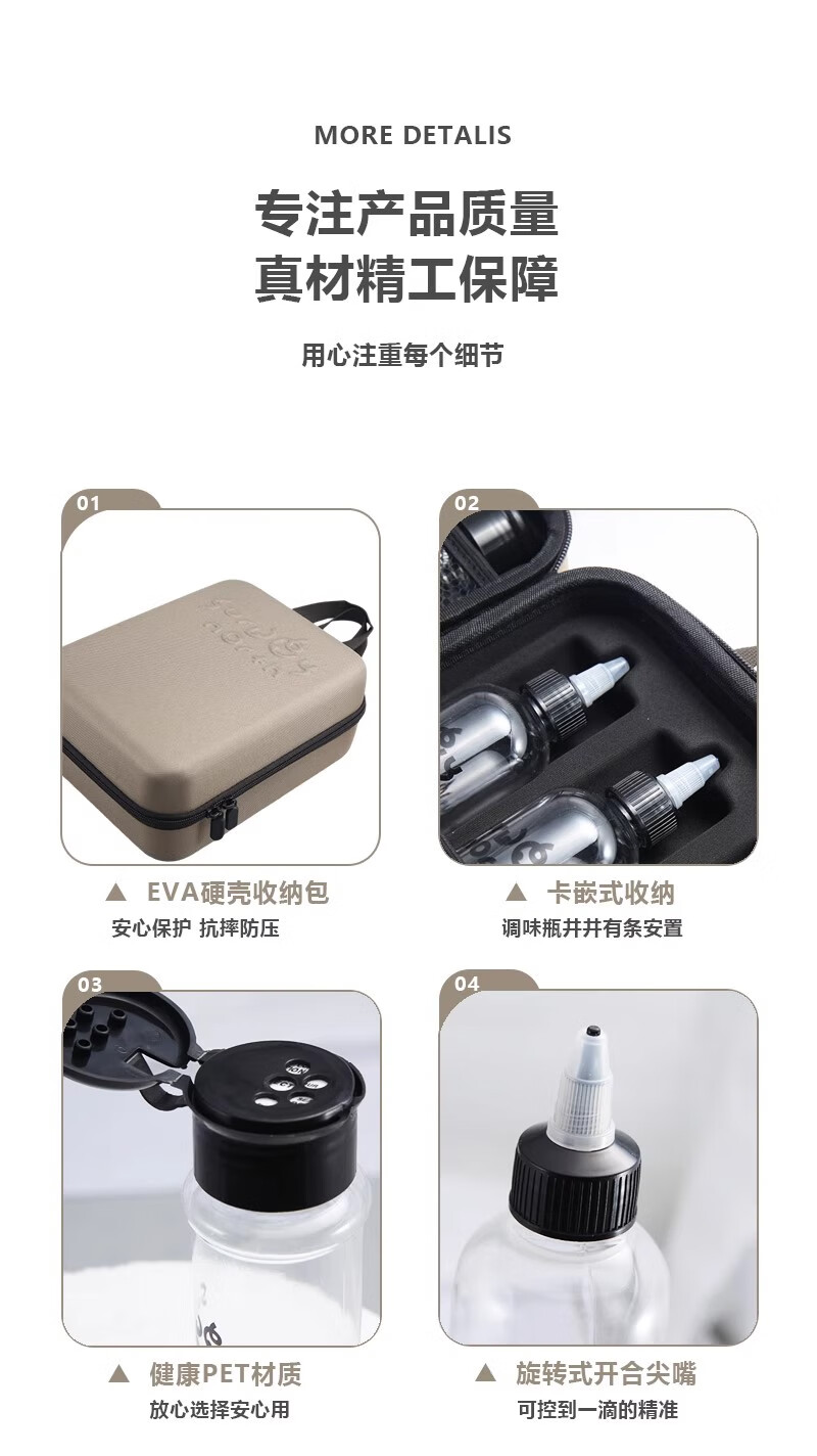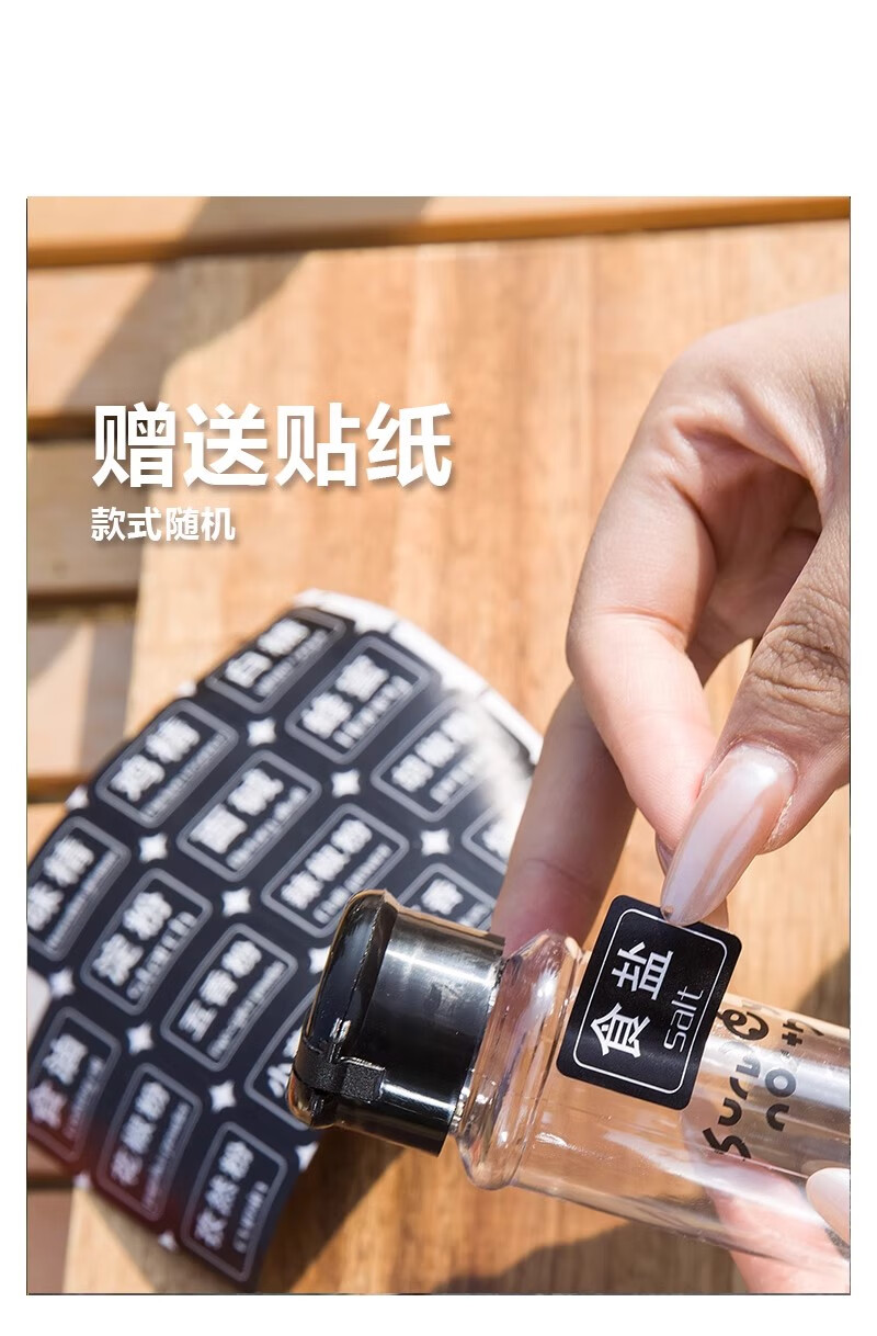 SURVEY NORTH的这套调味瓶套装真的太棒了!首先,它的设计非常实用,粉料瓶和液体瓶分开,避免了混合和漏出。其次,收纳方便,PET材质轻便耐用,携带出门毫无压力。最惊喜的是还送了贴纸,可以根据自己的喜好装饰瓶子,非常贴心。总之,这套调味瓶套装不仅实用,而且美观,强烈推荐!