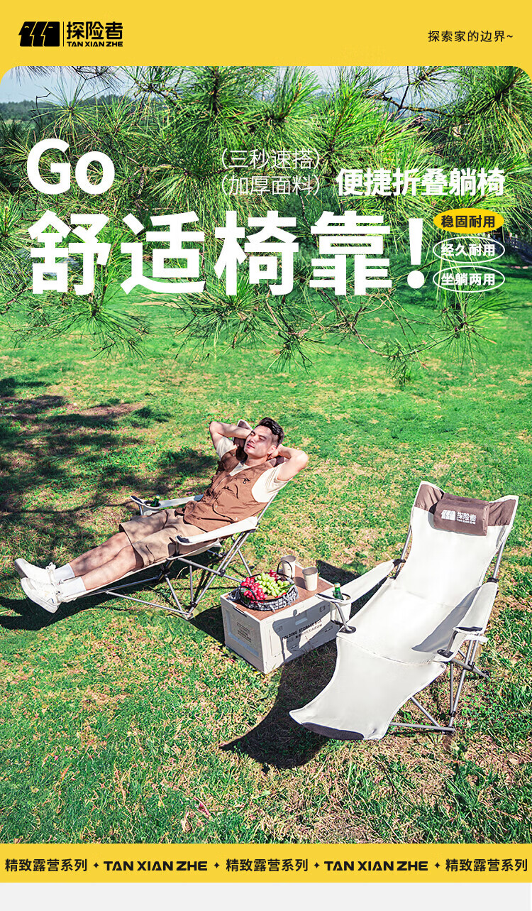 一直想找一款便携式的户外躺椅,玩累了就可以躺着休息睡觉!找来找去还是选中了探险者的这款可坐可趟户外椅。首先很信任它的质量,之前买了好多该品牌的户外拖车,桌椅,帐篷了,非常好用。这款躺椅真的很不错,性价比很高,值得推荐!
