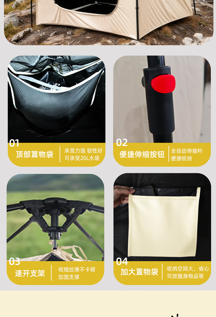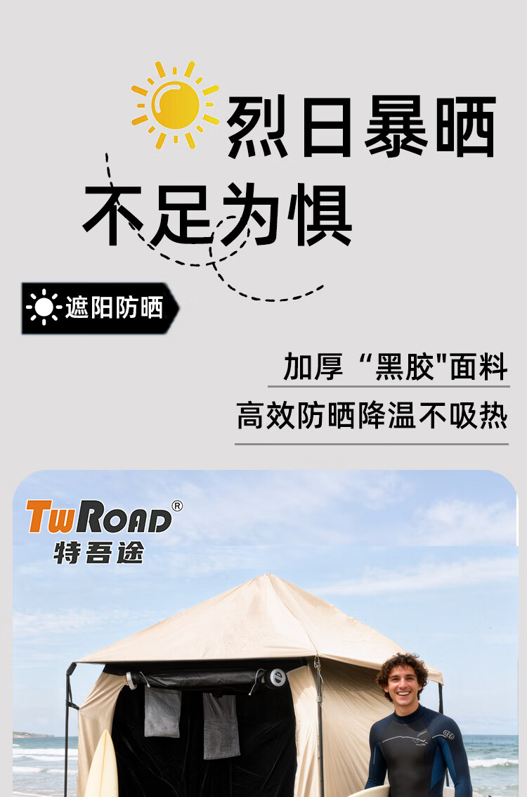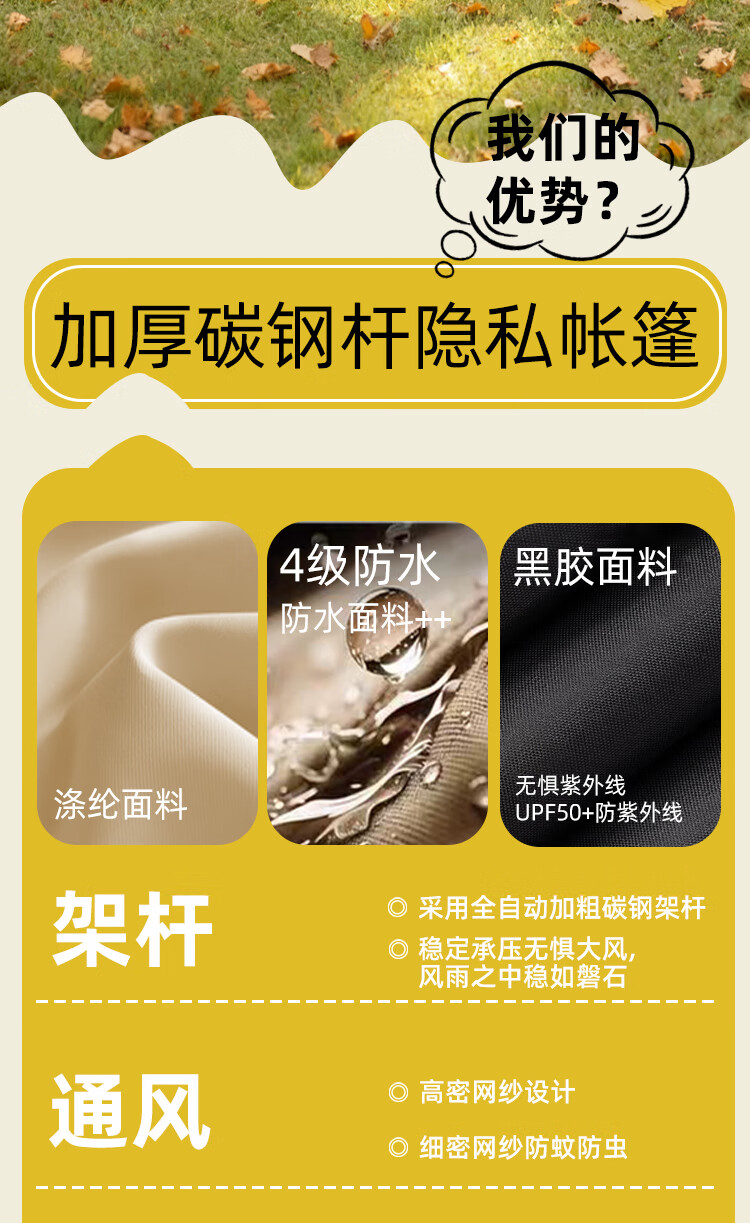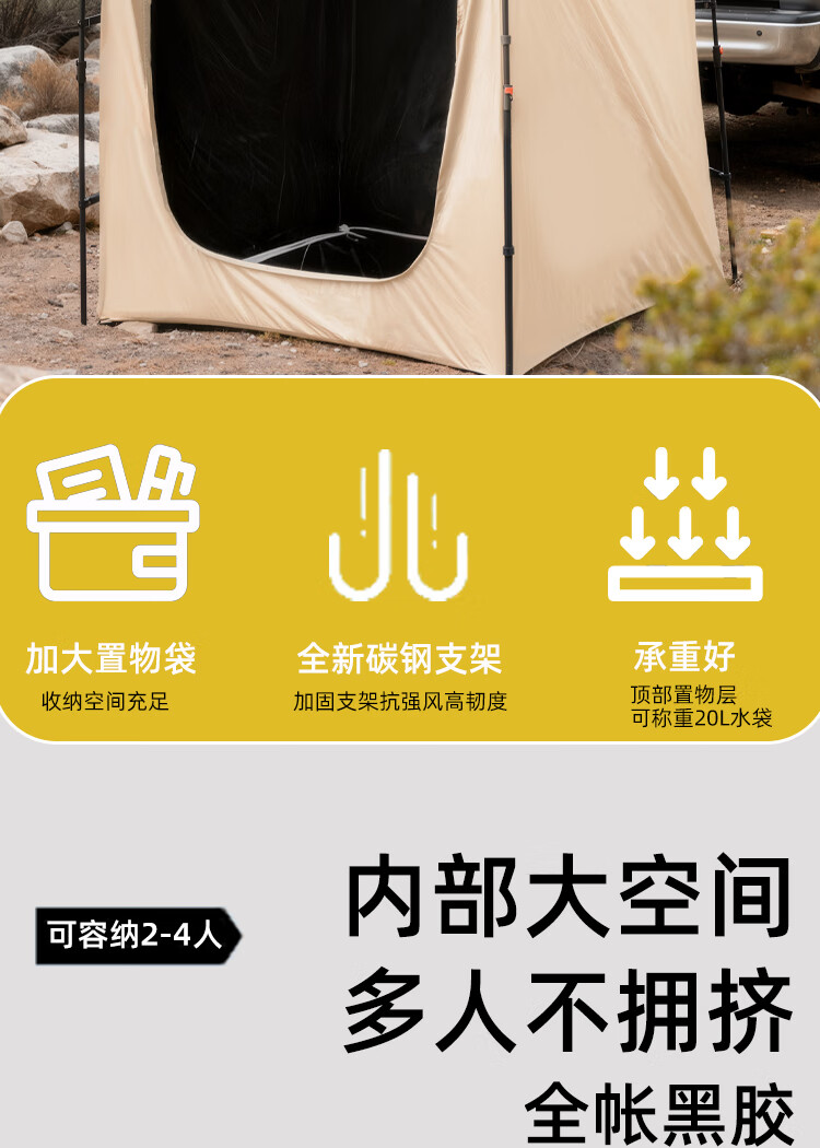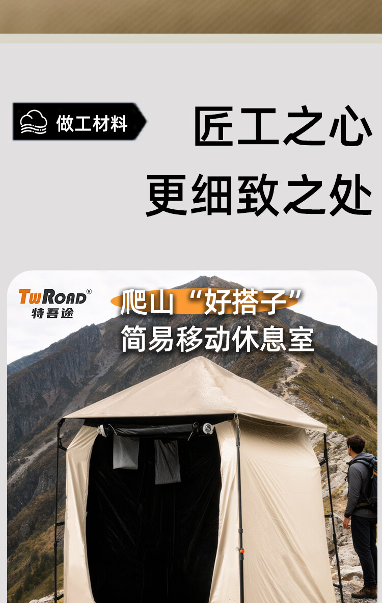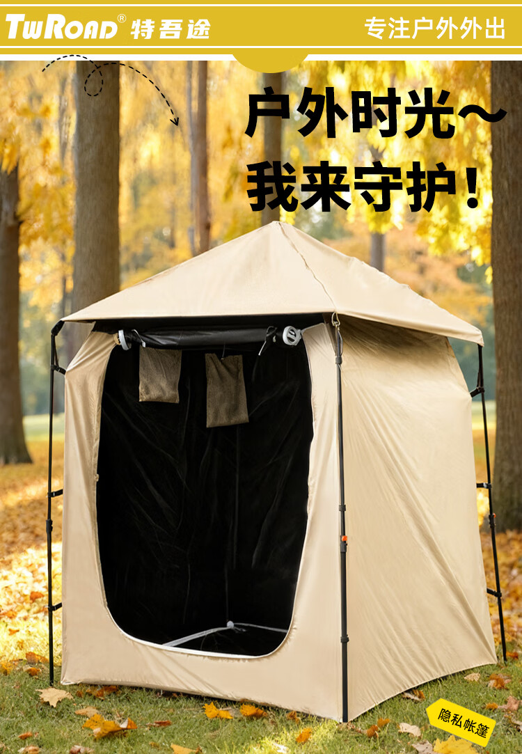 特吾途户外黑胶金属杆隐私帐篷农村洗澡淋浴野钓防雨便携露营更衣 卡其色【黑胶-强遮光】 150*150*205【户外洗澡换衣】
