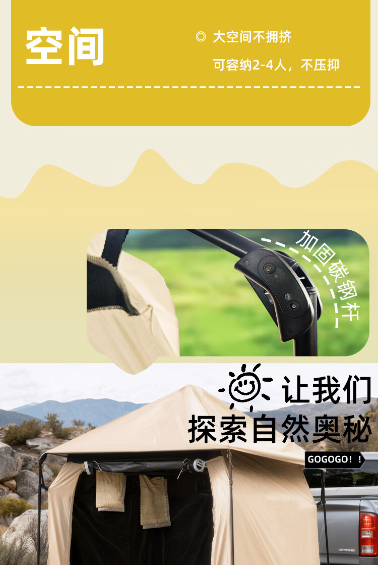 这款帐篷真心不错,收纳方便,说走就走。黑胶材质遮光效果好,隐私性很强,周末露营用了几次都很满意。搭建简单,一个人也能搞定,空间够大,性价比很高。