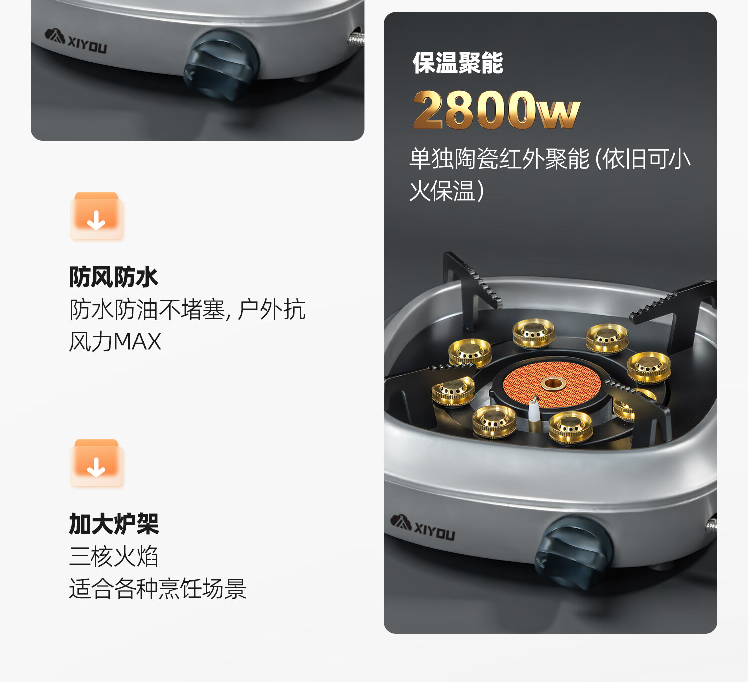 收到货了,炉子真心不错,三种火焰模式聚能加热,烧水非常给力,还能可以调节保温模式,简直不要太好用了,分体式设计,气瓶和炉子可以隔开一米的距离用着很放心。旋钮点火控气一体设计也很便携,一打就着,还是有稳压装置的,不小心气瓶打翻了也没有影响,金属外壳配上银色非常有质感!需要的小伙伴完全可以放心购买!