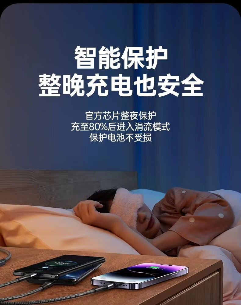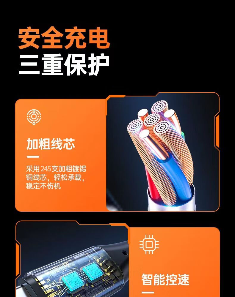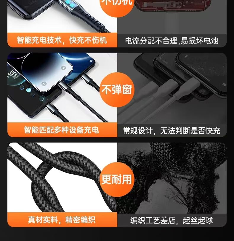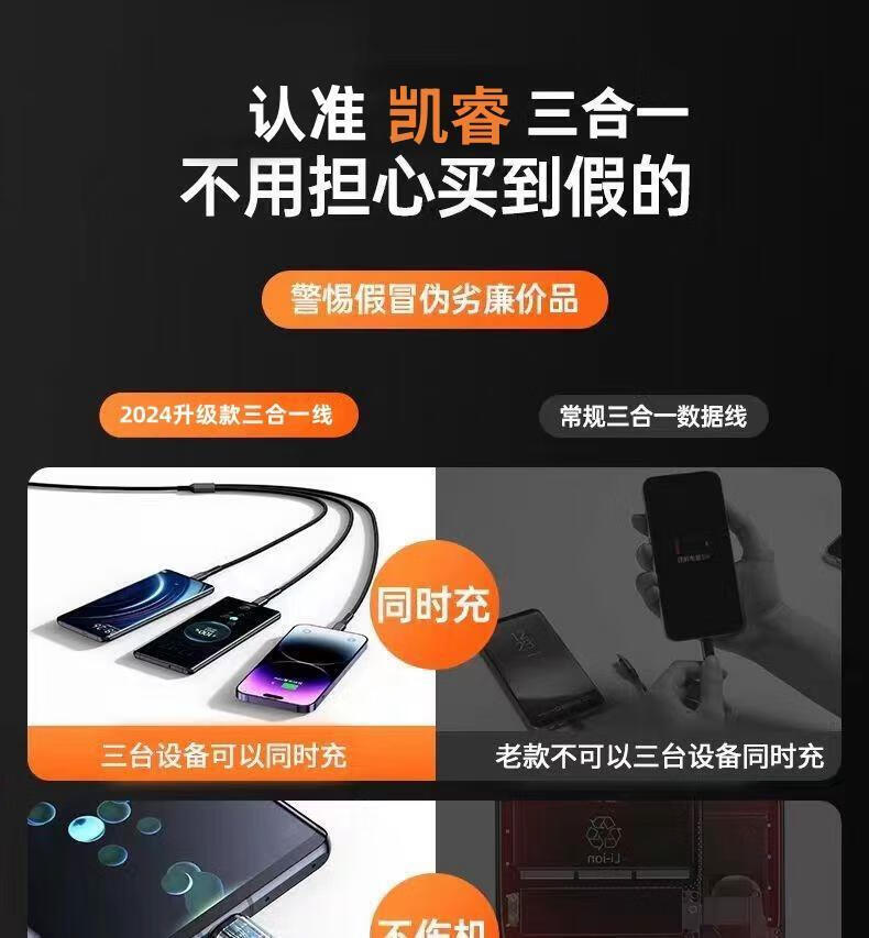 质量可靠。这次换手机了。充电快,确实比原装更低温,不会发烫。这个三合一分量足,接口看着质量也好,链接稳定,不错