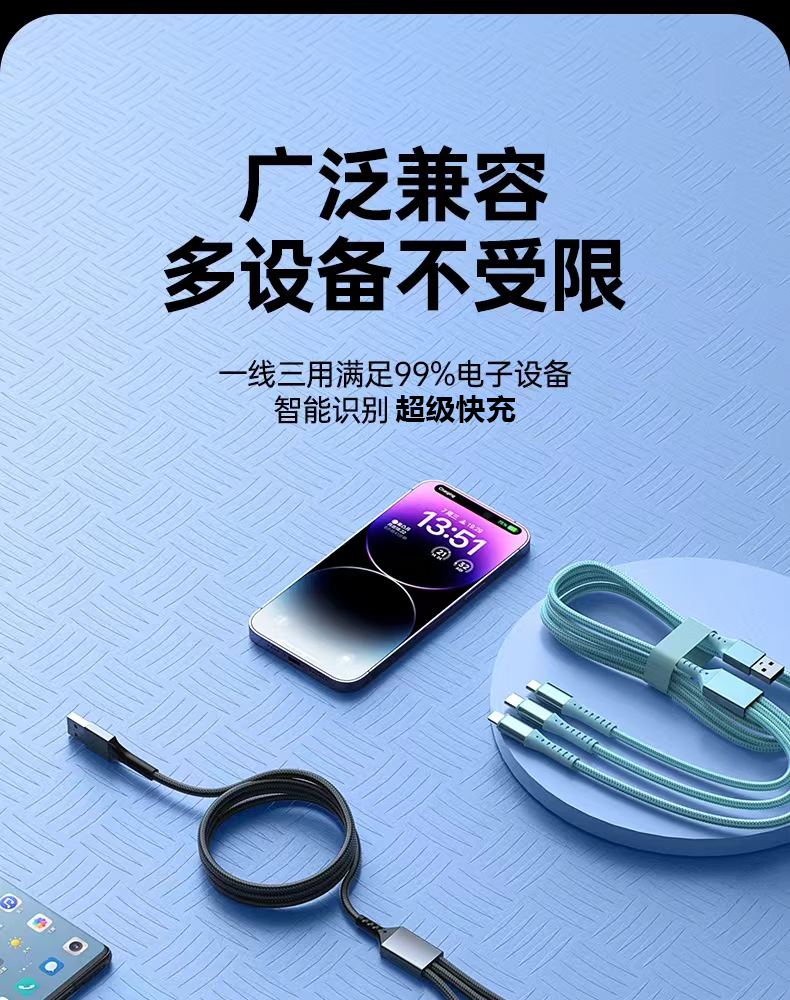 三头充电线已收到,感觉质量非常好,充电很快,非常匹配,长度也够,三个头非常方便,出差带上这一个就全部解决了,好评!