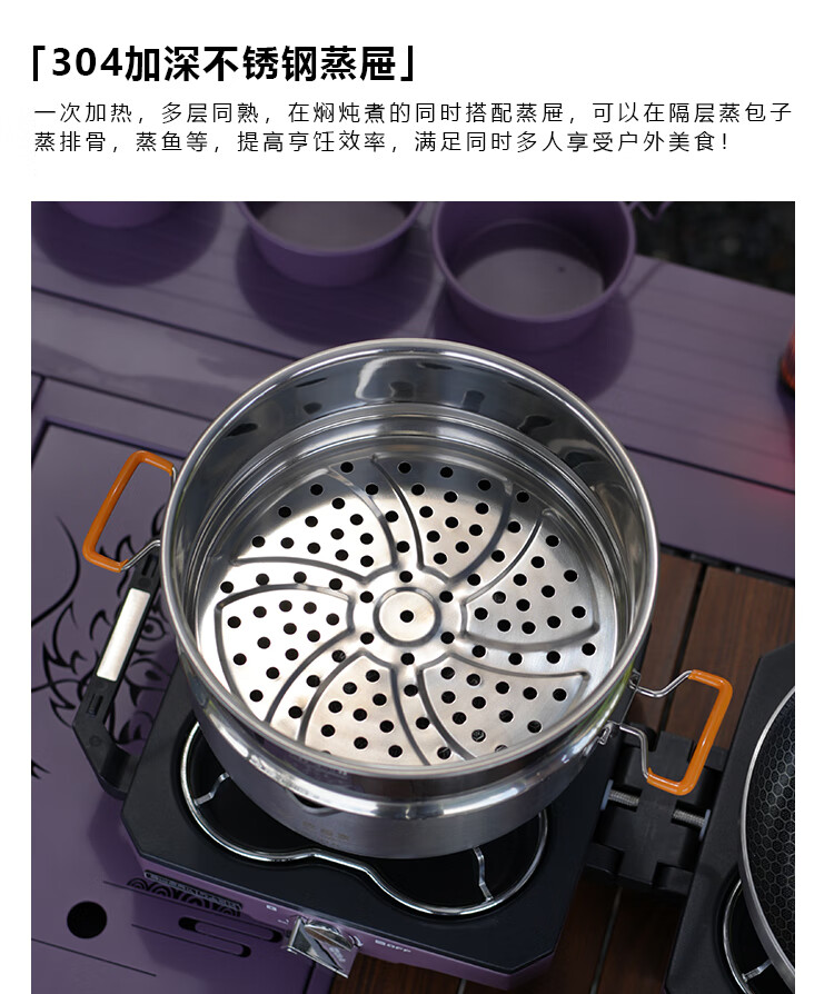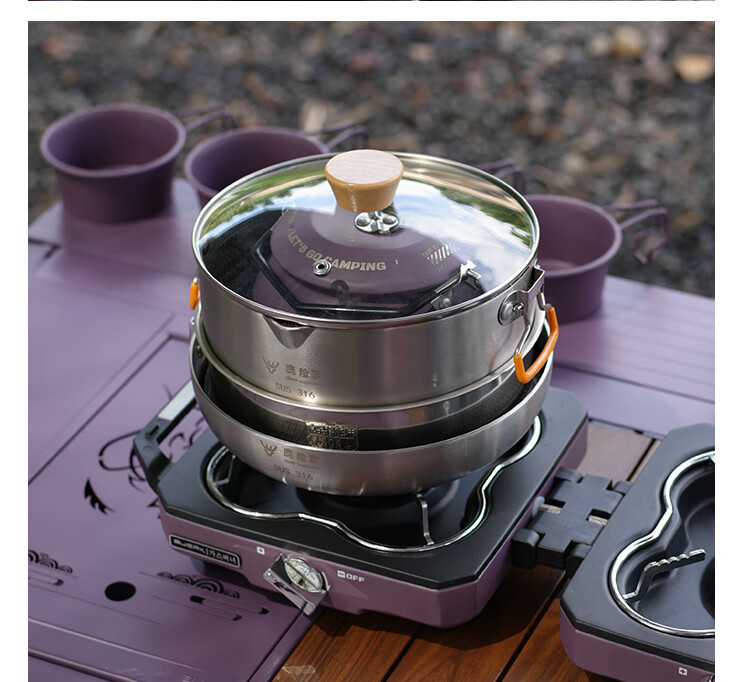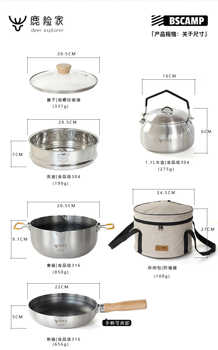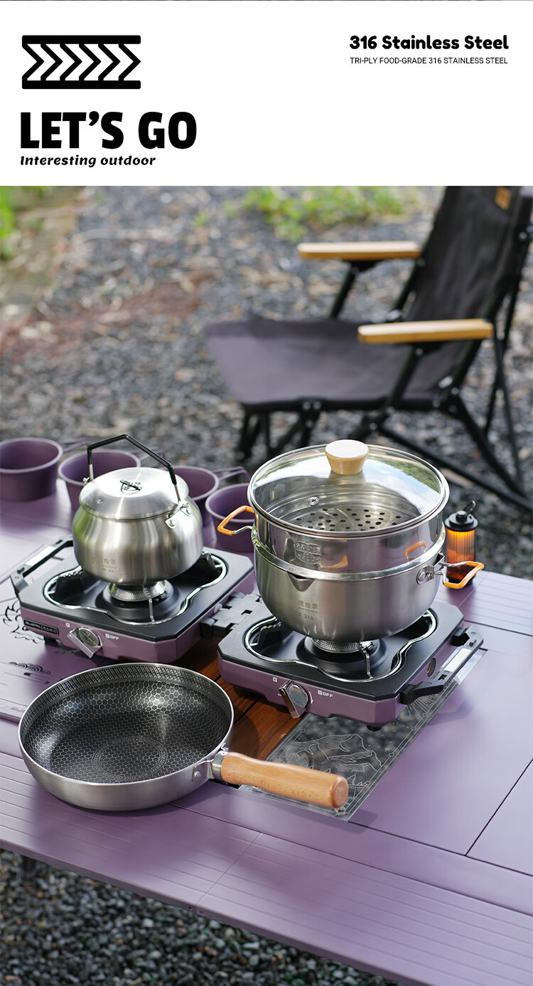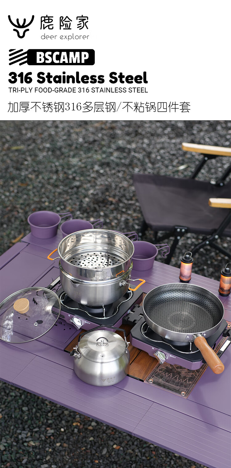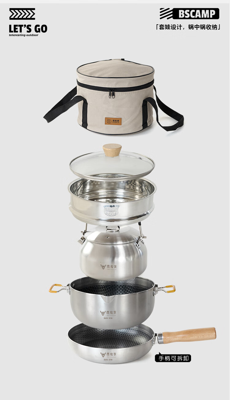 鹿险家户外露营锅具套装316不锈钢野营装备野餐用品 【锅具四件套】316煮锅+316煎锅+304水壶+304蒸屉