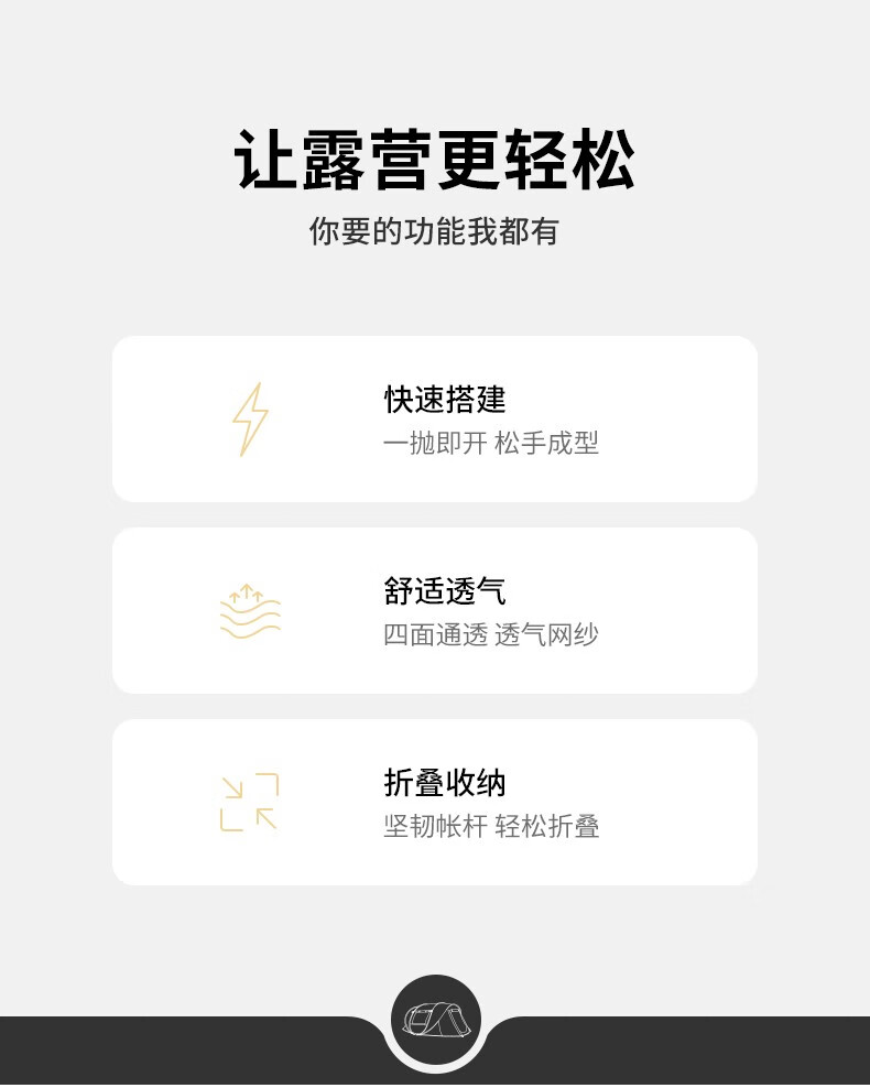 帐篷质量超赞!面料厚实防水,暴雨天也没漏雨,支架稳固抗风不晃。安装超简单,一人半小时搞定,空间宽敞够两人住,内里透气不闷。颜值还高,露营出片绝了,收纳后体积小易携带,性价比拉满,已推荐给朋友!