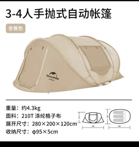 Naturehike挪客全自动免搭建手抛式自动帐篷 3-4人速开帐篷户外露营防风防雨 3-4人手抛式自动帐篷-杏黄色