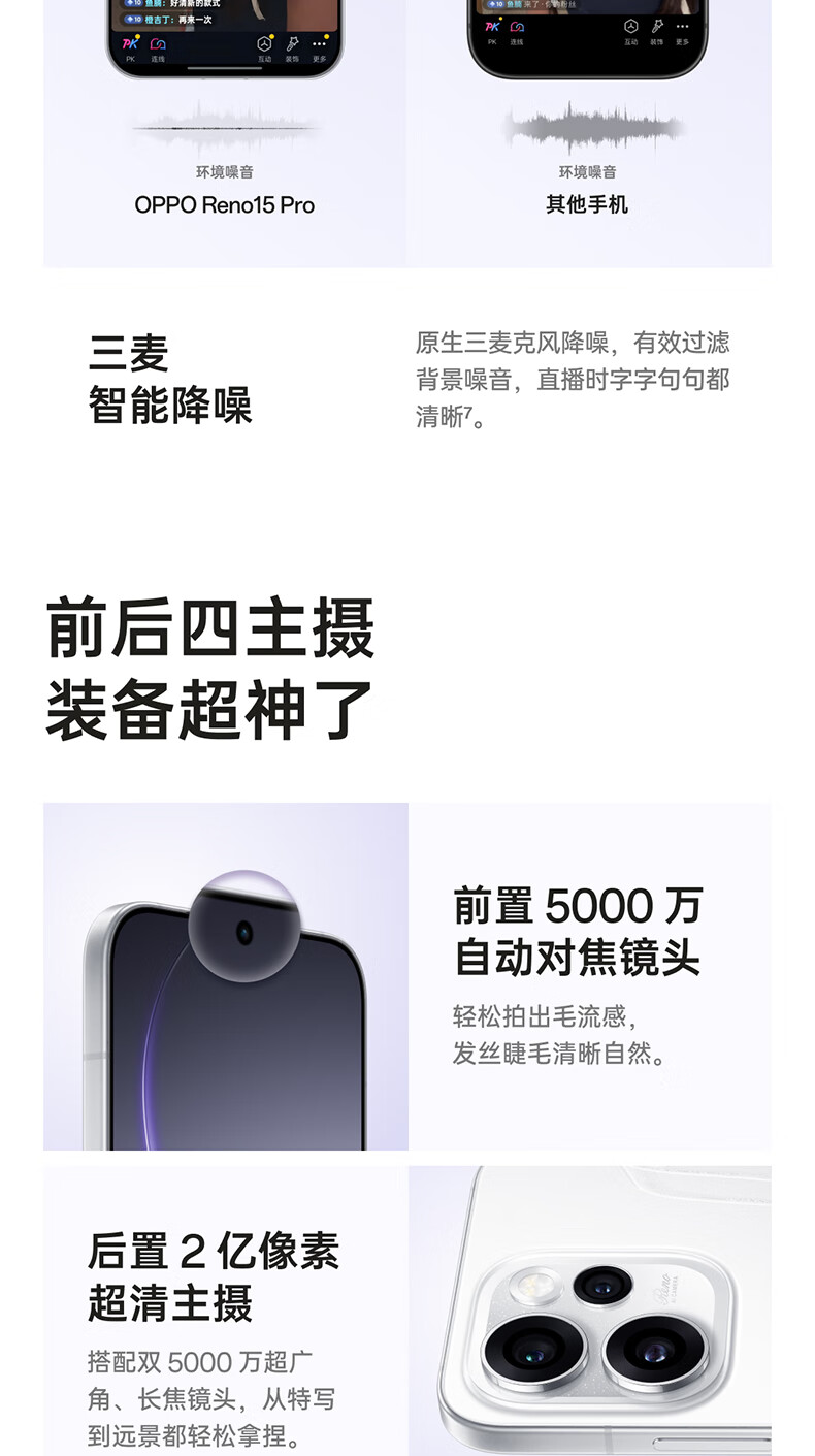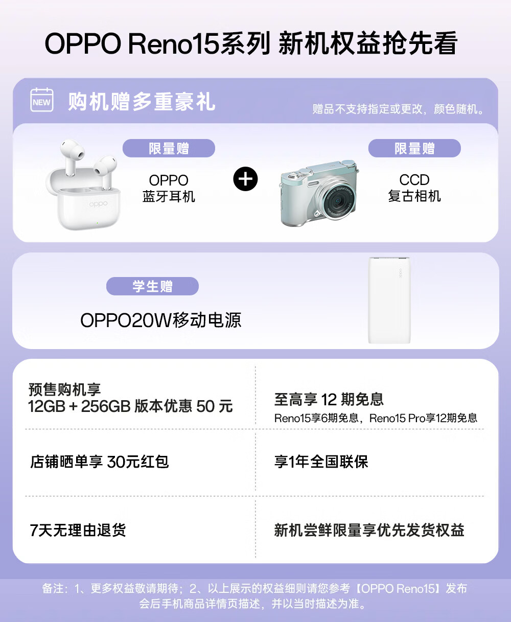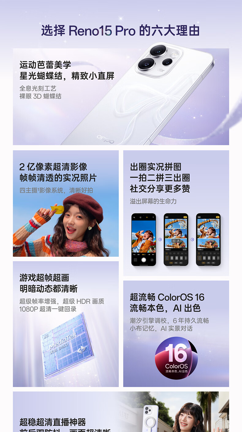 OPPO【耳机+CCD】OPPO Reno15 Pro 新品手机reno15pro超清拍照手机oppo直播超稳超清 2亿超清影像 星光蝴蝶结 12GB+512GB OPPO蓝牙耳机+CCD复古相机