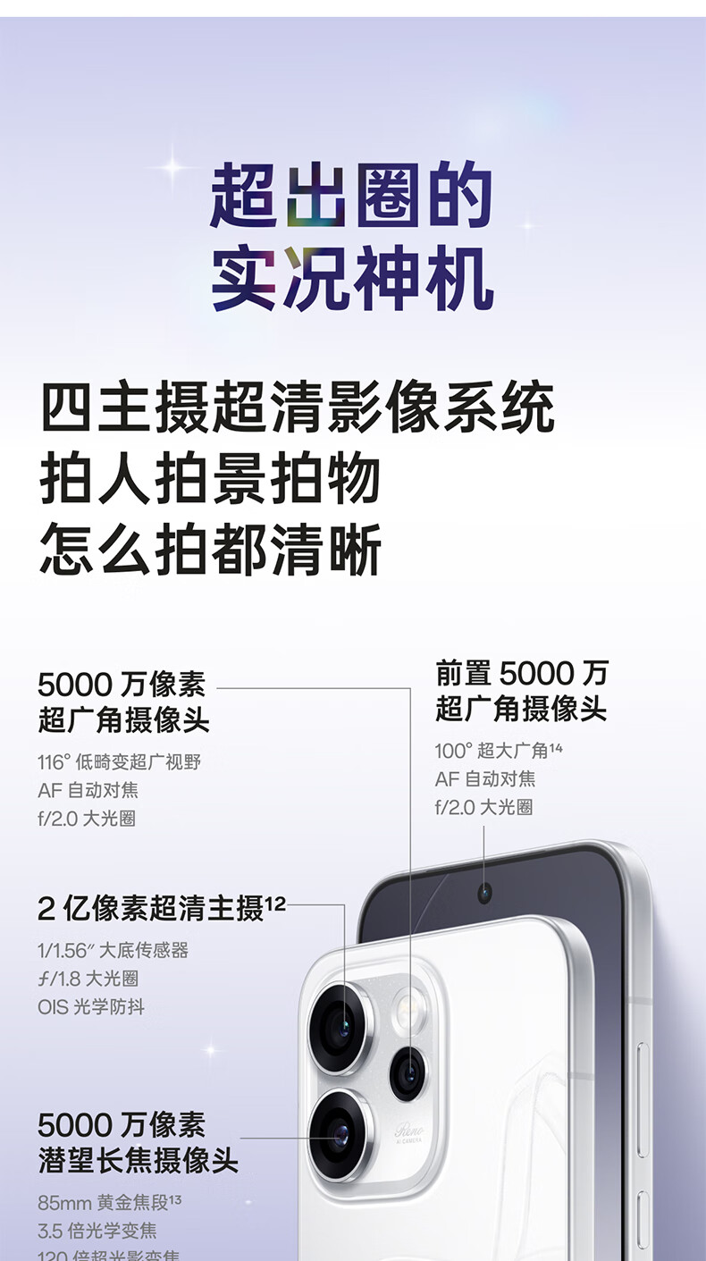 AI大模型,高频PWM调光,全焦段影像,潜望式长焦,防水防尘,无线充电,NFC,大底主摄,磁吸无线充