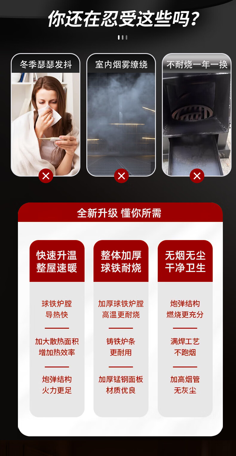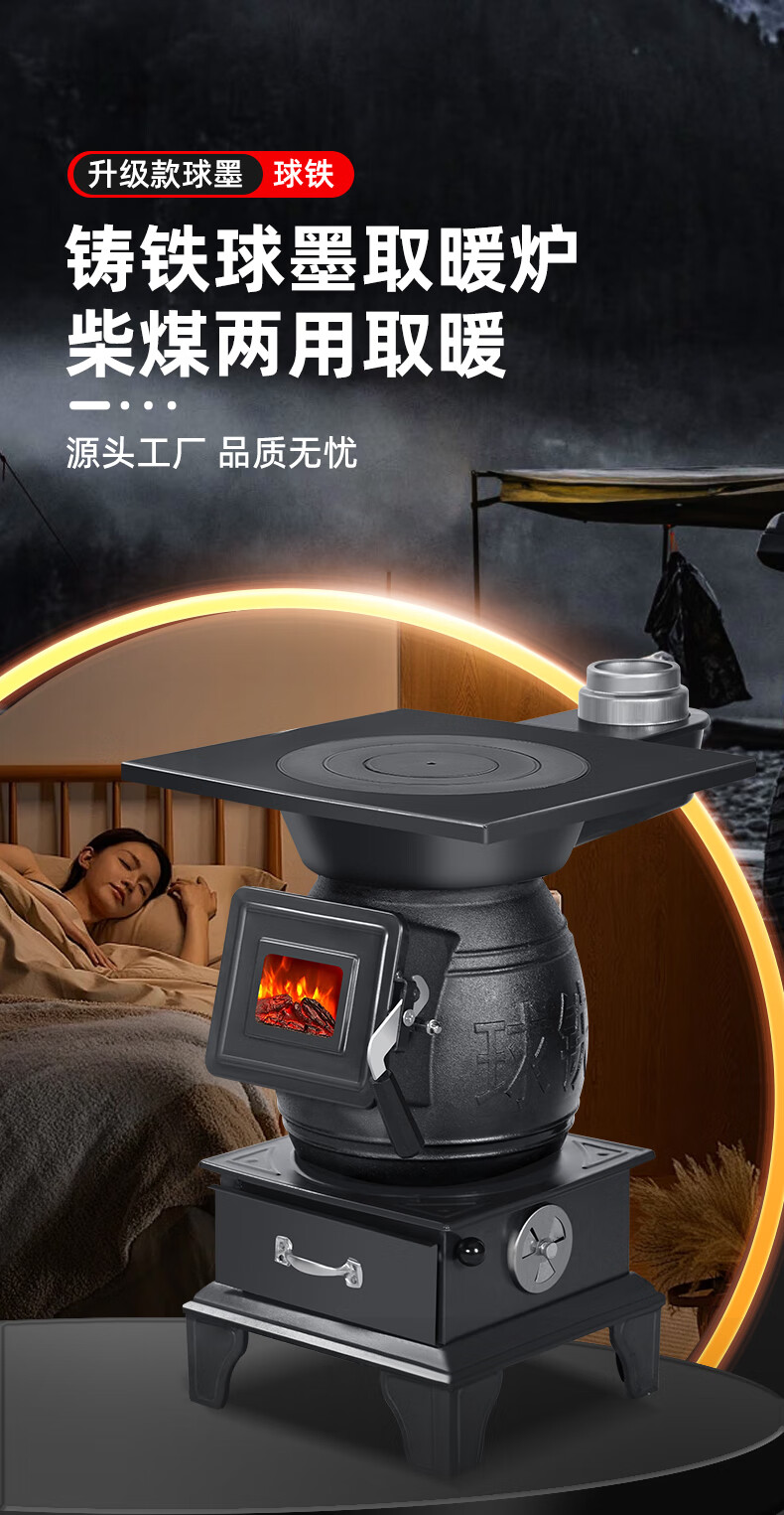 花乐集铸铁加厚取暖炉新款柴煤两用煤炭炉子采暖柴火农村家用室内火炉 大号铸铁炮弹炉