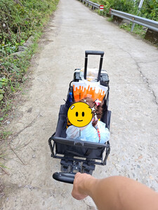 越野版轮子超级大,这个尺寸坐两个小孩+行李箱都没压力。下坡的时候它自己就能滚。平地拉起来也轻松。