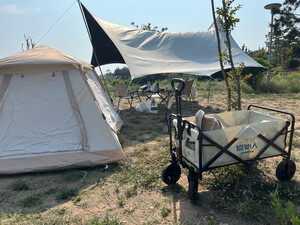 露营车简直是户外夜班露营必备神器。折叠打开很方便,承重力非常好,帆布面也很结实,收纳起来也不占地方。基本上天幕,桌椅帐篷地垫等等都一车装的下。轮子很大,很结实,我自己拉了一车装备趴了一个45度的烂路都没太费劲,以后继续添置用品都会优先看原始人家的👍👍👍