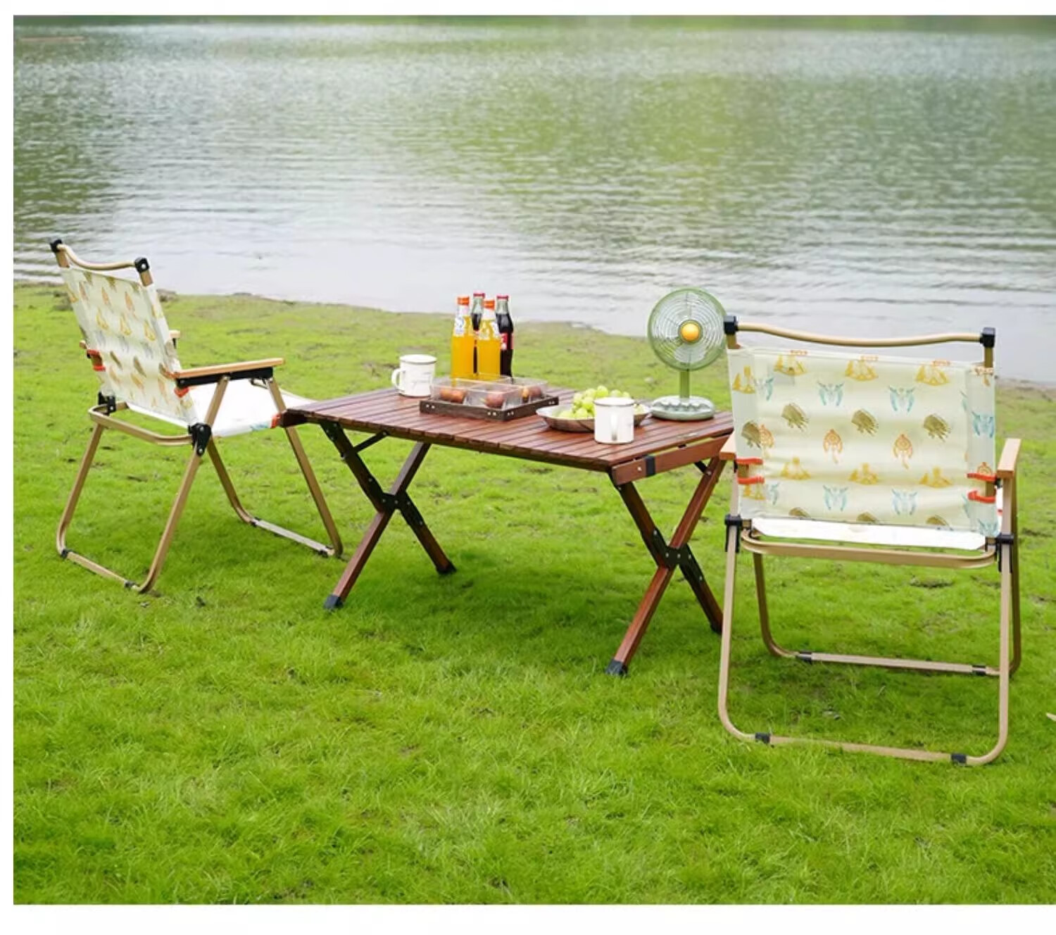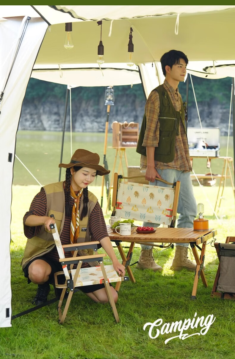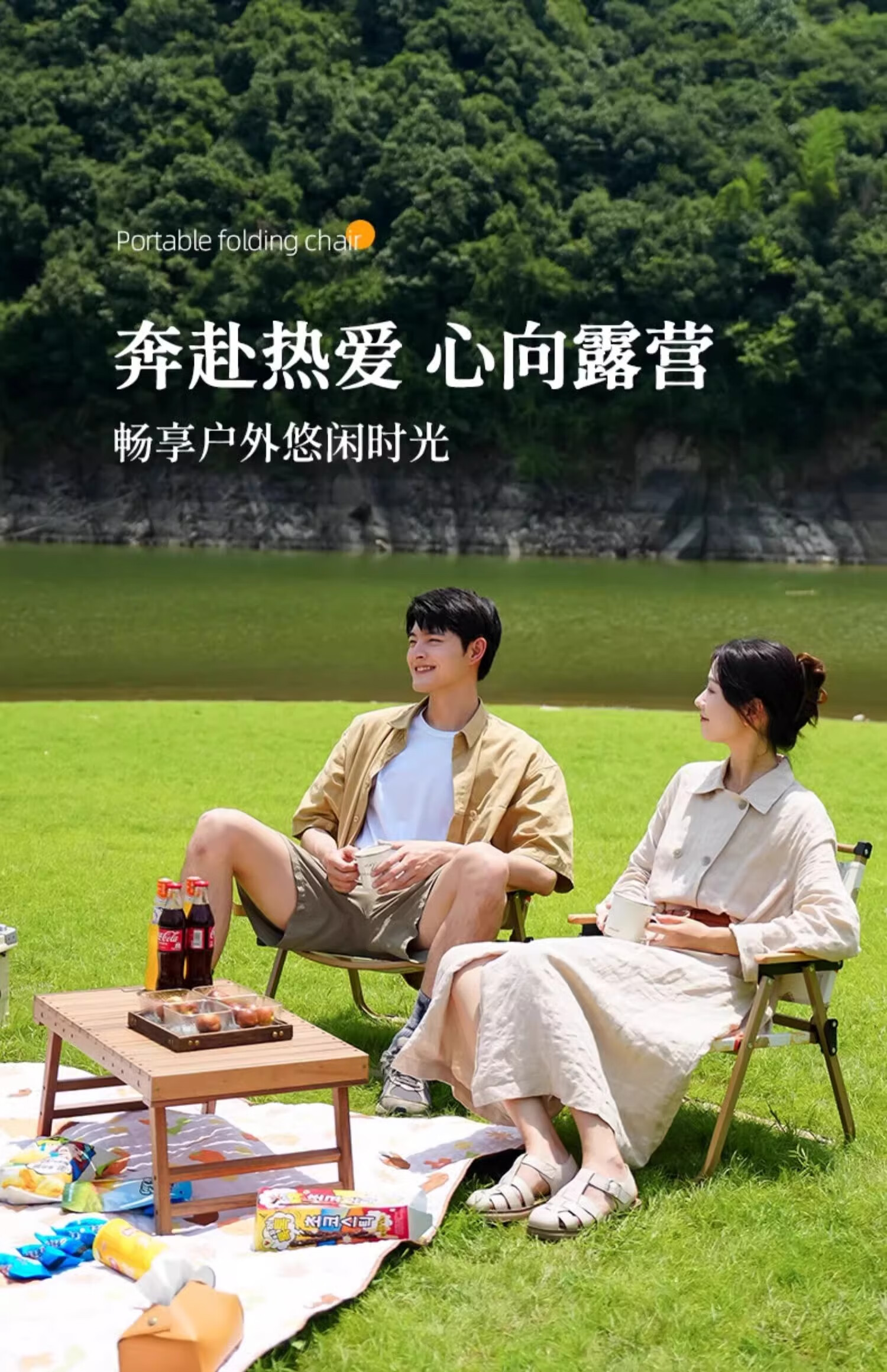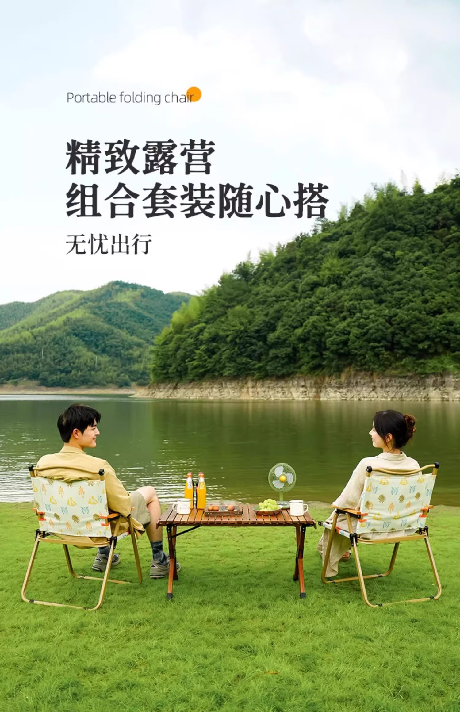 原始人月亮椅户外折叠椅子便携钓鱼凳野外露营野餐躺椅野营沙滩椅 90CM木色蛋卷桌+绒面款月亮椅*2
