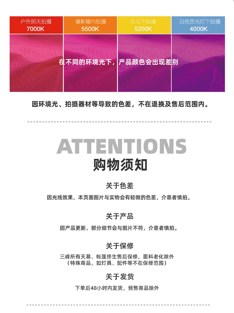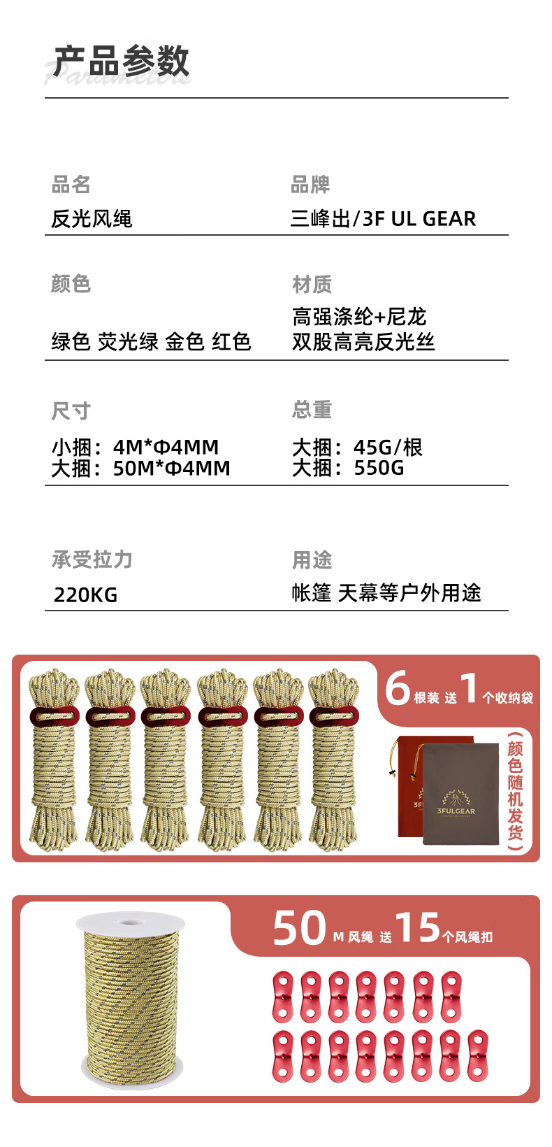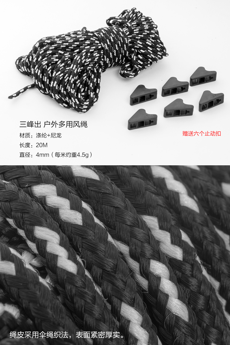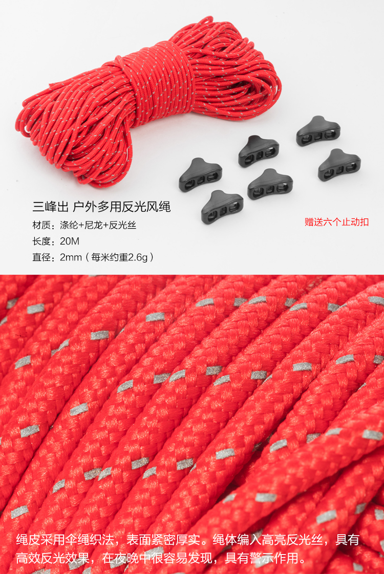 三峰出的东西都挺有质感的,大品牌有保障。绳子质量挺好,颜色鲜艳,白天不易拦到,袋子手感很好,醒目特别好找,风绳扣质量挺好无毛刺。