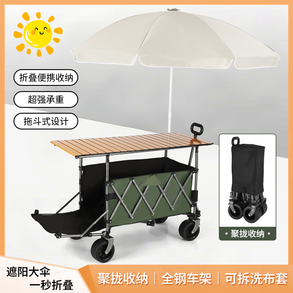 大号摆摊车露营车后开带遮阳伞升降折叠户外营地拖斗小推车手拉车 拖斗聚拢【黑绿车+120木纹升降桌板】飞机轮