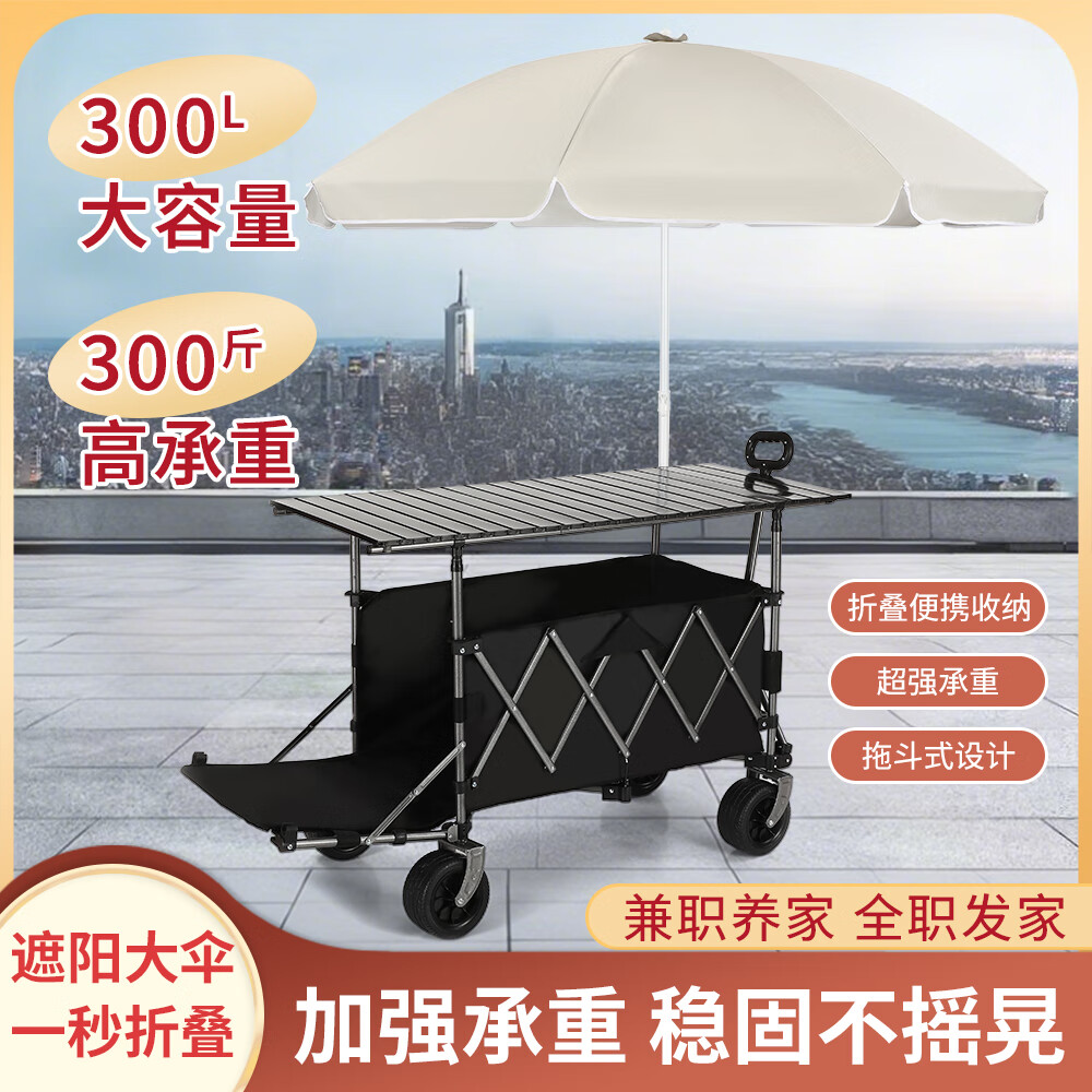 摆摊小推车户外露营车遮阳伞升降桌营地手拉车野餐折叠拖车夜市车 10寸飞机轮【黑色车+120黑色桌子+大伞】拖斗款